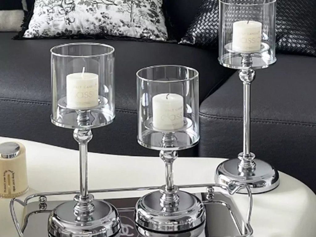 Krásný doplněk do interiéru - potříbřený svícen se skleněným cylindrem.