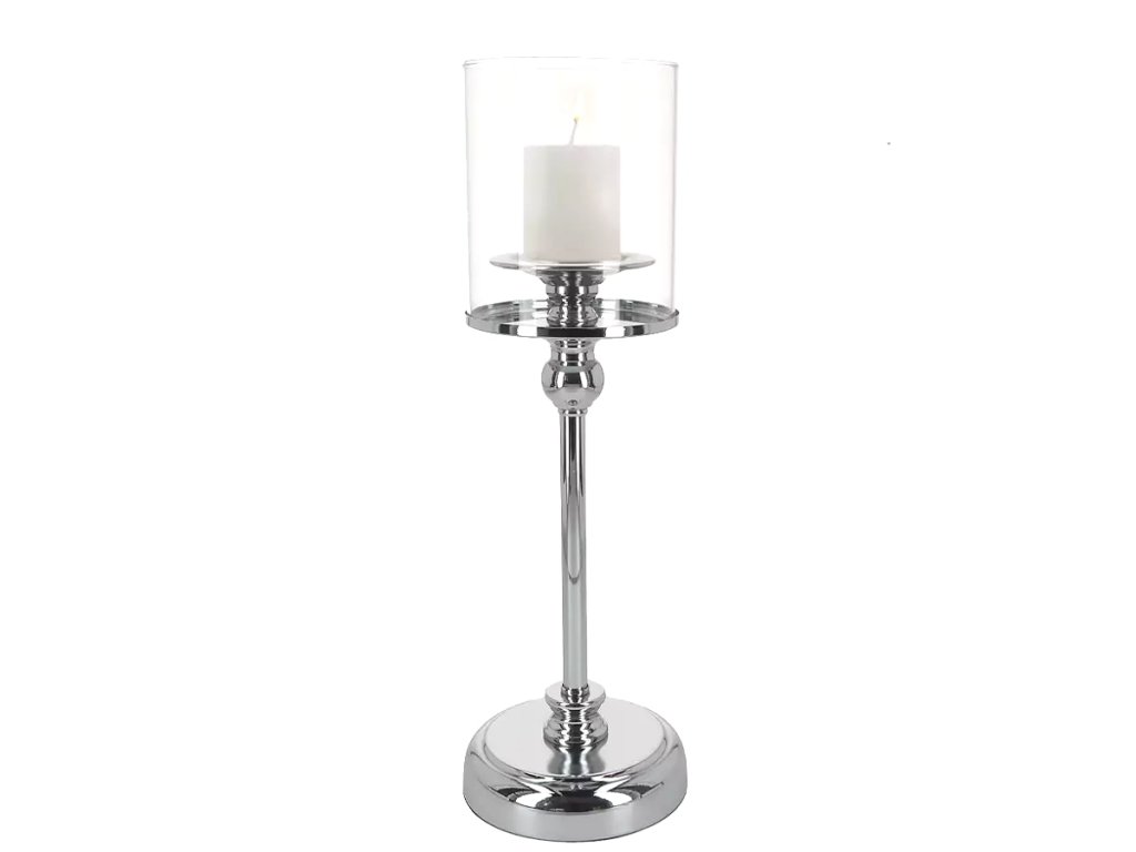Svícen plechový se skleněným cylindrem 36 cm - stříbrný