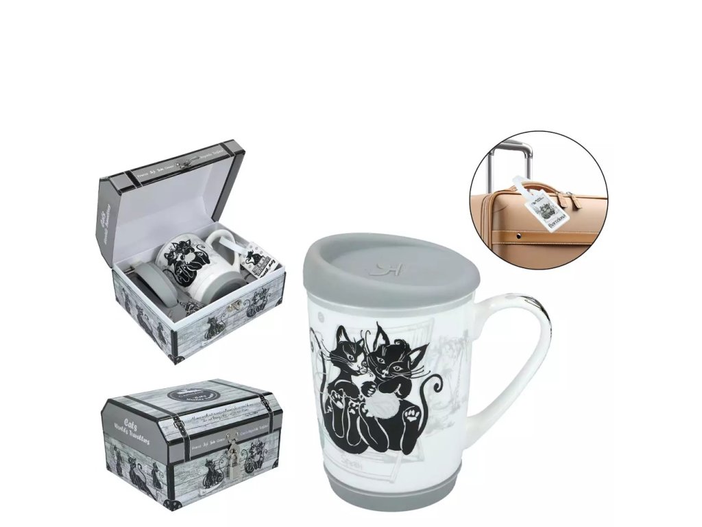 Porcelánový hrnek se silikonovým víčkem a podstavcem, aby hrnek držel na různém povrchu. Dárková krabička ve tvaru lodního kufru. Na krabičce je malý kovový visací zámeček. V sadě je plastová jmenovka na kufr.