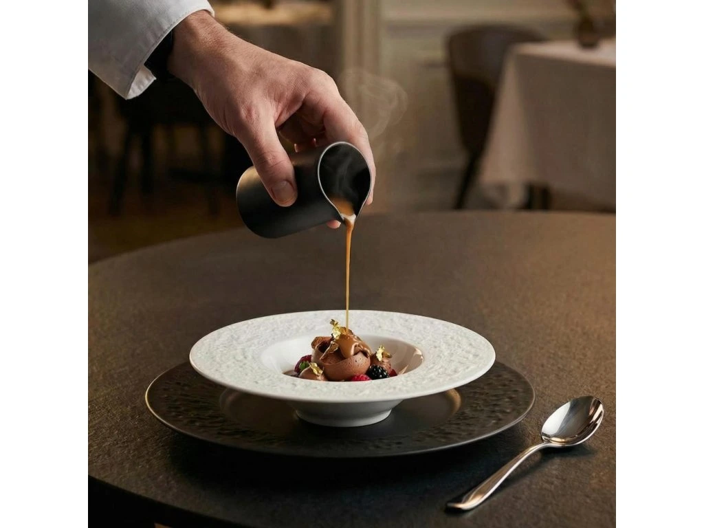 Téměř 11 cm vysoký porcelánový omáčník v matt černé barvě, který lze použít pro stylové polití připraveného pokrmu omáčkou v duchu fine dinningu, nebo také jako mlékovku při servírování kávy. Lze použít v mikrovlnné troubě i myčce na nádobí. Suisse Langenthal – švýcarský design, česká preciznost Suisse Langenthal je prestižní švýcarská porcelánová značka s tradicí od roku 1906. Proslavila se čistým designem, kvalitními přírodními surovinami a vysokou odolností, kterou oceňuje profesionální gastronomie po celém světě. Dnes je značka součástí skupiny G. Benedikt a její porcelán se vyrábí v České republice, kde navazuje na dlouhou středoevropskou tradici porcelánové výroby. Kolekce Suisse Langenthal spojují švýcarskou estetiku s moderní technologií a precizním řemeslem.