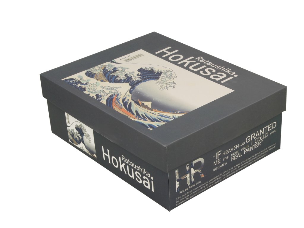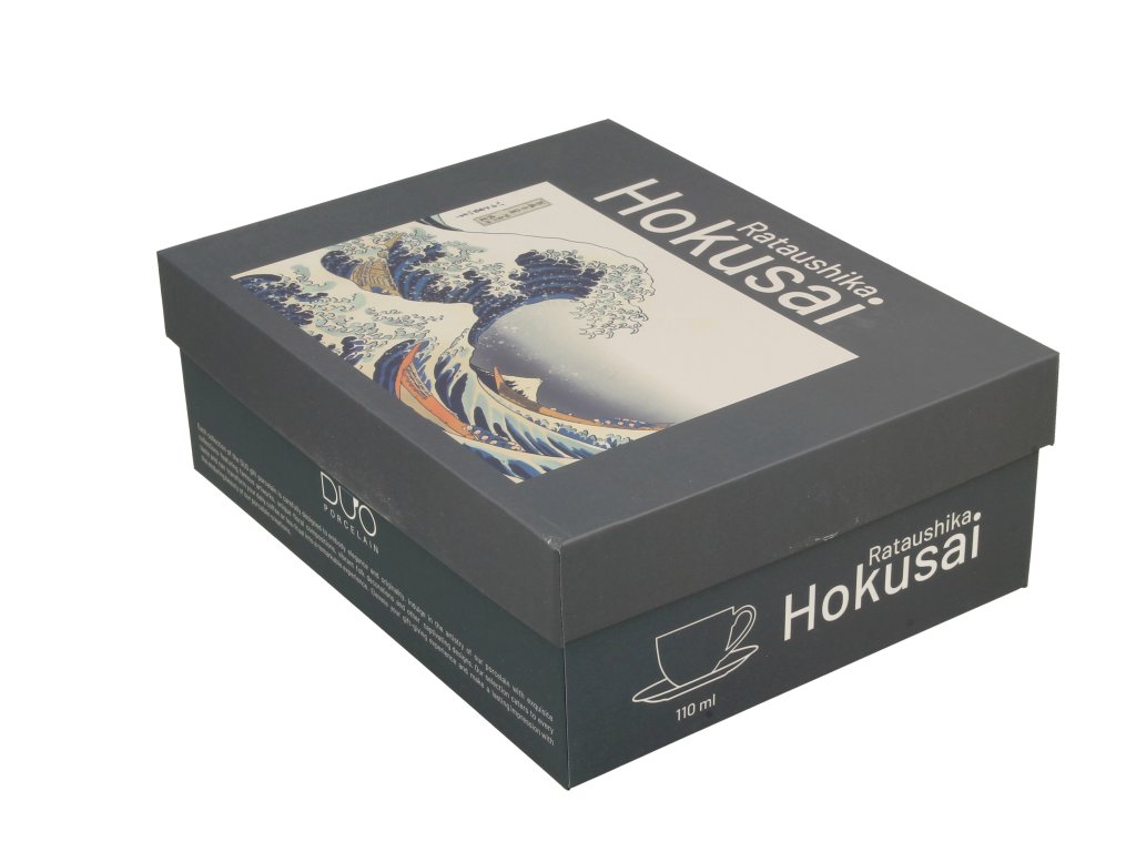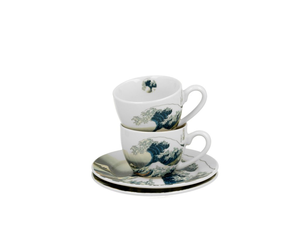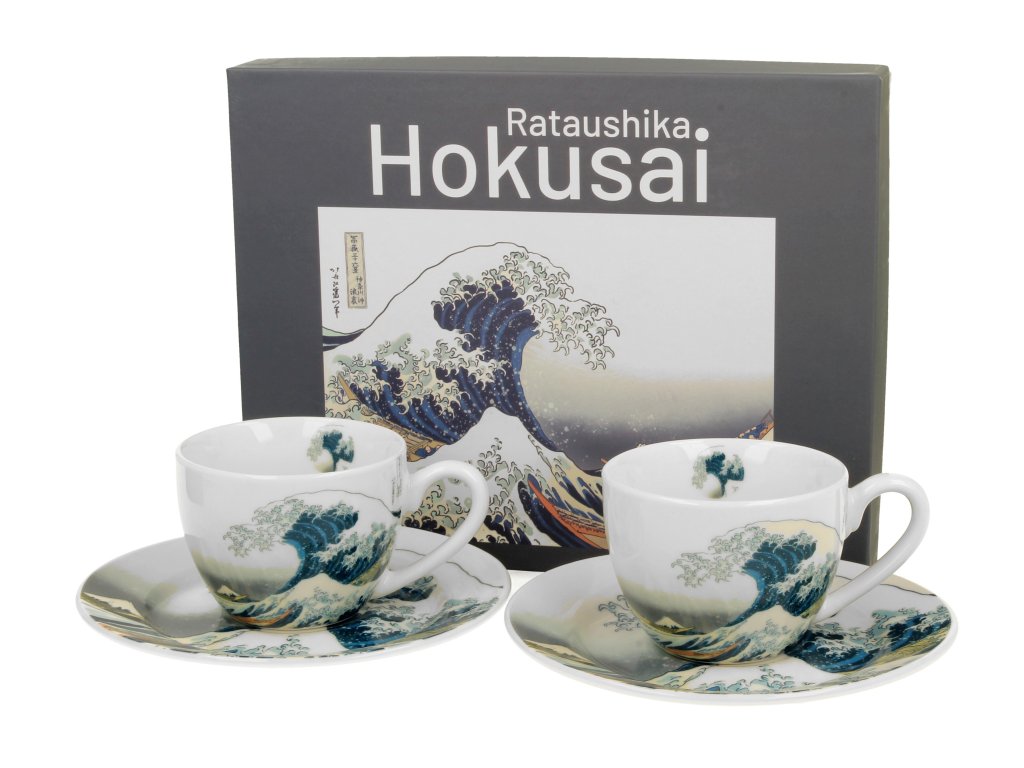 Dva 110ml šálky na espresso s podšálky THE GREAT WAVE inspirované HOKUSAI, součást série Art Gallery, vyrobené z kvalitního porcelánu, vyznačující se elegantní a přírodní krémově - bílou barvou s jemným leskem a mimořádnou odolností při zachování lehkosti a pochoutka. Linka je vyrobena z bílého porcelánu zdobeného fragmentem dřevořezové reprodukce "Velká vlna z Kanagawy" od Hokusai Katsushika. Harmonické a klidné barvy námořnické modři a modré v kombinaci s jemným zlacením uspokojí chutě i těch největších milovníků japonského umění. Celý zabalený v ozdobné krabičce zdobené stejným motivem je skvělým nápadem na originální dárek nejen pro milovníky malby a umění. Velká vlna u Kanagawy z roku 1831 je jedním z nejcharakterističtějších děl japonského umění. Představuje motiv působivé mořské vlny, která je symbolem nezkrotných přírodních sil tváří v tvář lidské slabosti. Tisky se nacházejí v mnoha různých uměleckých sbírkách v muzeích po celém světě. Hokusai Katsushika je jedním z nejvýraznějších japonských malířů, který měl obrovský vliv na evropské impresionisty.