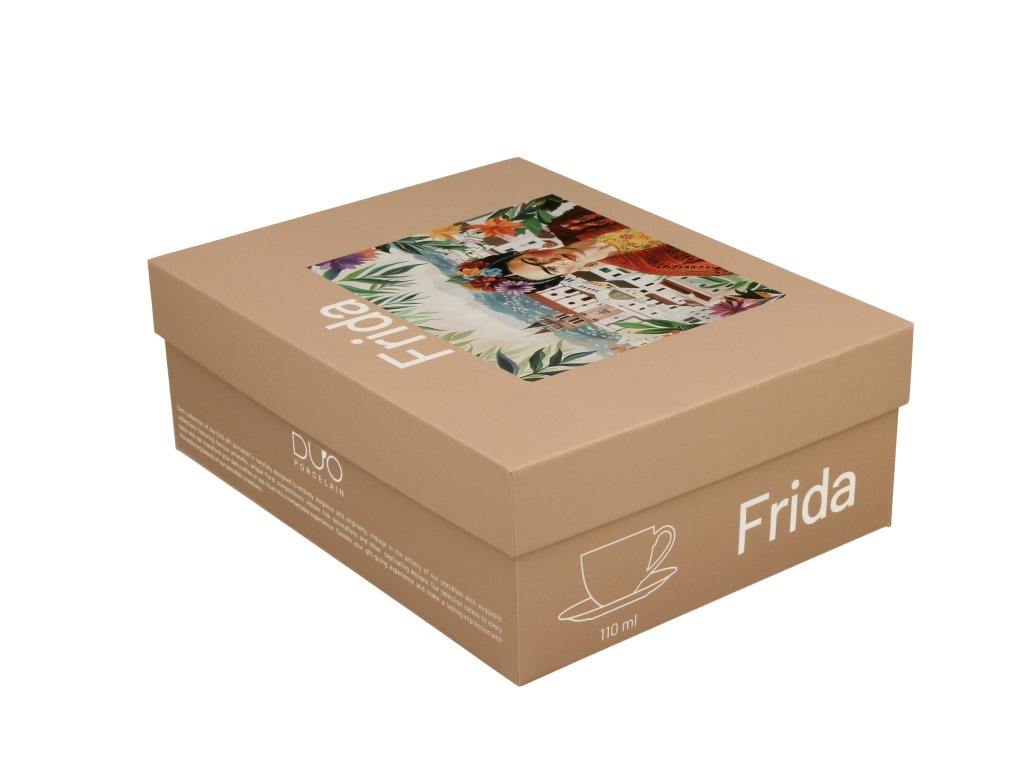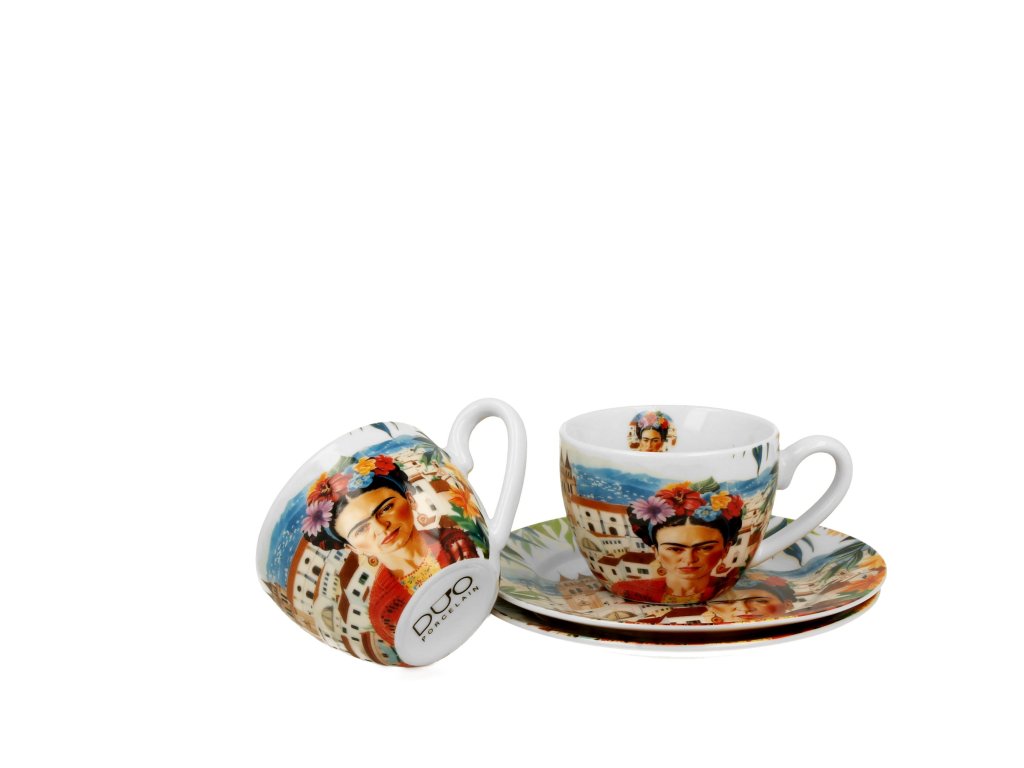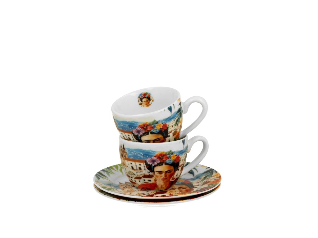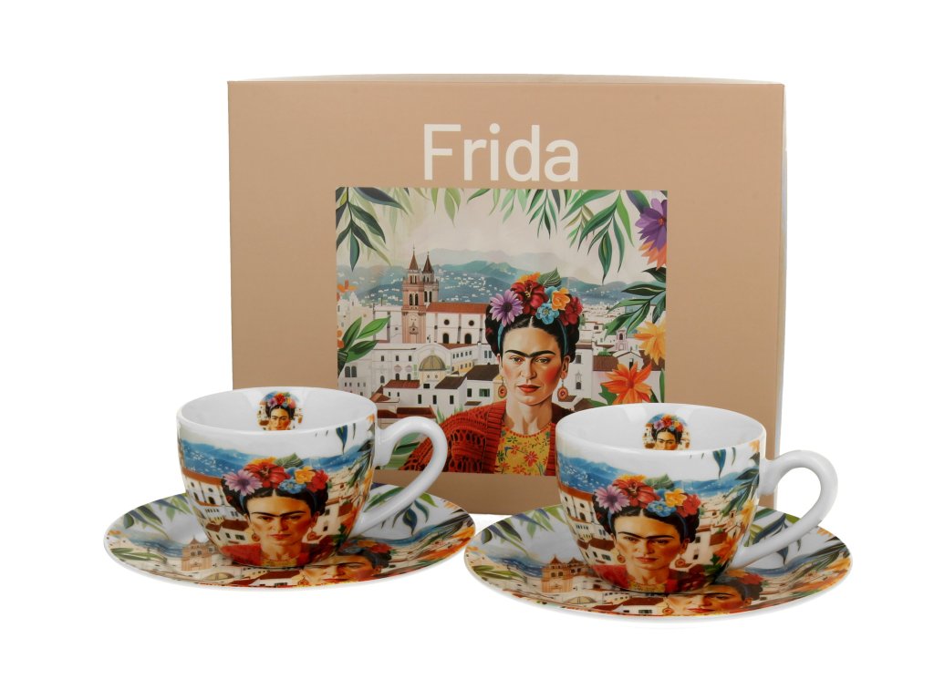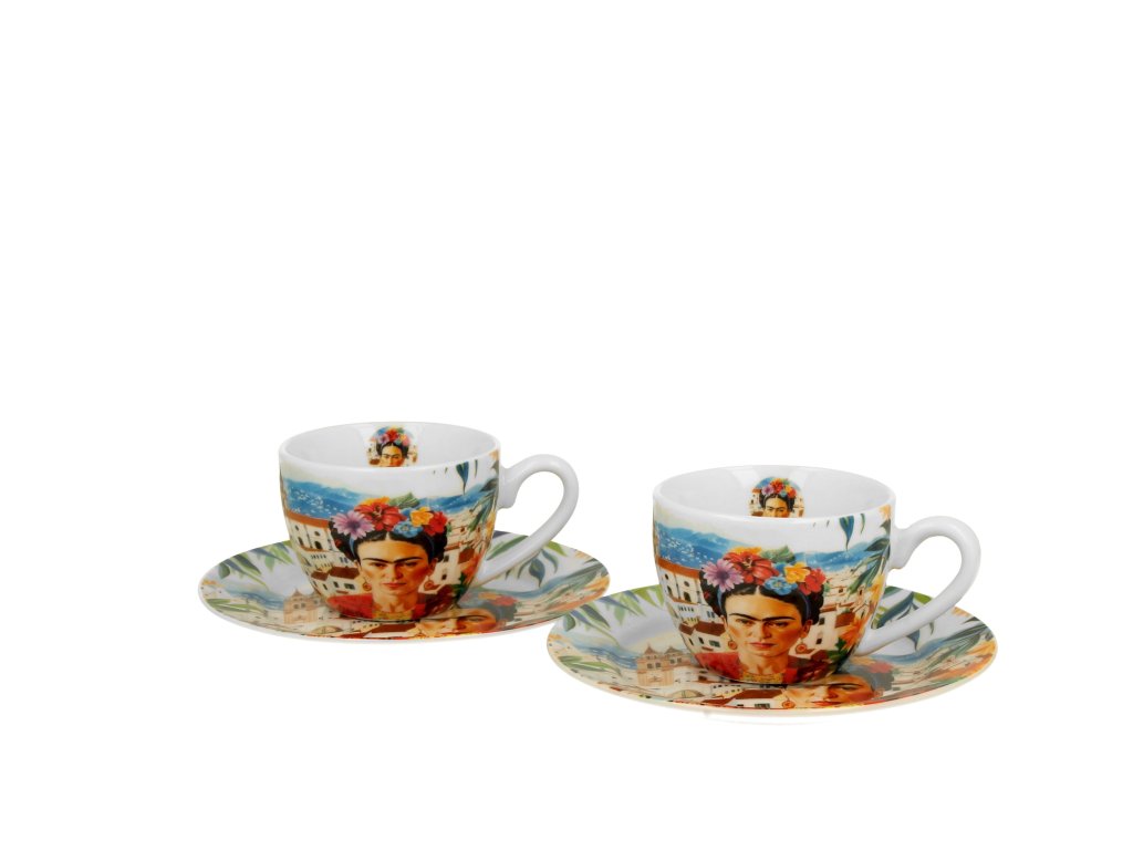Porcelánové šálky s podšálky na espresso Frida Kahlo Vás potěší nejen při popíjení oblíbeného nápoje, ale také svým jedinečným dekorem mexické malířky z počátku 20. století Fridy Kahlo.