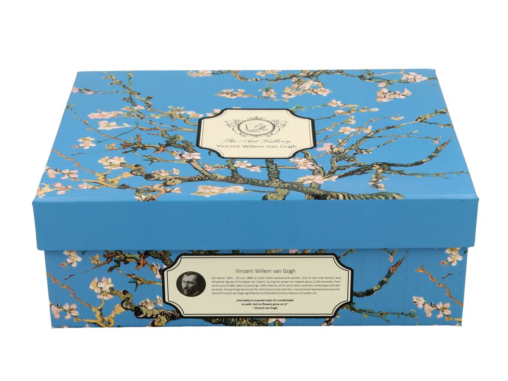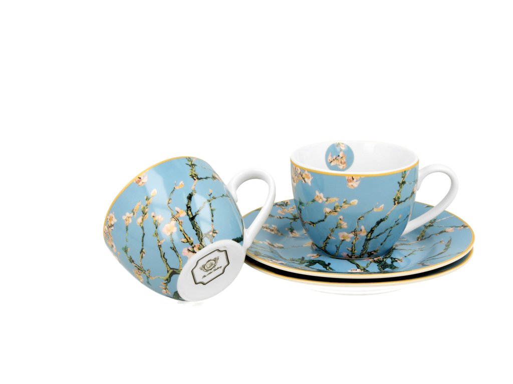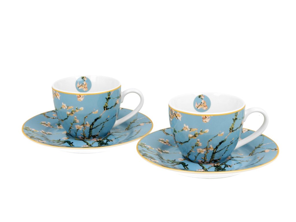 Dva šálky na espresso 110 ml s podšálky Almond Blossom od V. van Gogha ze série Art Gallery, vyrobené z porcelánu New Bone China, charakterizované elegantní a přirozenou krémově bílou barvou s jemným leskem a výjimečnou trvanlivostí při zachování lehkosti a pochoutka. Linka je uvnitř vyrobena z bílého porcelánu, zdobená reprodukcí van Goghova obrazu „Blooming Almond Tree“. Tlumené barvy jemné modré a měkké bílé činí z nádobí harmonickou kombinaci klasiky a moderny. Vše zabalené v ozdobné krabičce zdobené stejným motivem je skvělý nápad na originální dárek k narozeninám pro ženu i muže, stejně jako dárek pro šéfa nebo učitele, také jako poděkování. Obraz „Blooming Almond“ z roku 1890 od Vincenta van Gogha je díky svému rodinnému charakteru jedním z nejvíce oceňovaných autorem. Umělec namaloval dílo pro svého novorozeného synovce, pojmenovaného po něm Vincent. Vzor na obraze je také odrazem van Goghovy fascinace japonským uměním.
