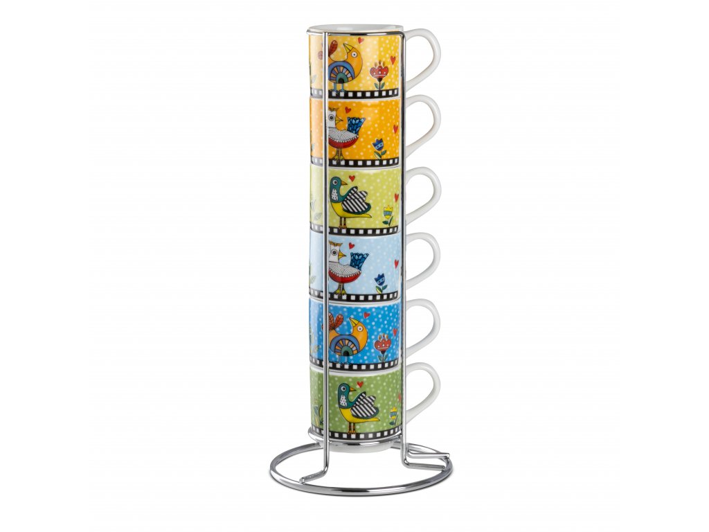Šest stohovatelných porcelánových šálků na kávu v oblíbeném dekoru ptáčků. Součástí balení je praktický stojánek do kterého se hrníčky snadno poskládají a zaberou tak méně prostoru. Vhodné do myčky nádobí a mikrovlnné trouby.