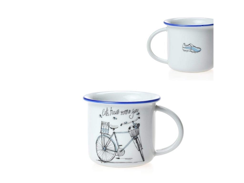 Hrnek Tina porcelánový plecháček 100 ml na espresso - pánské kolo s modrou linkou