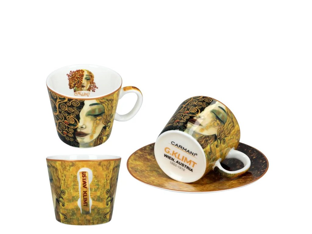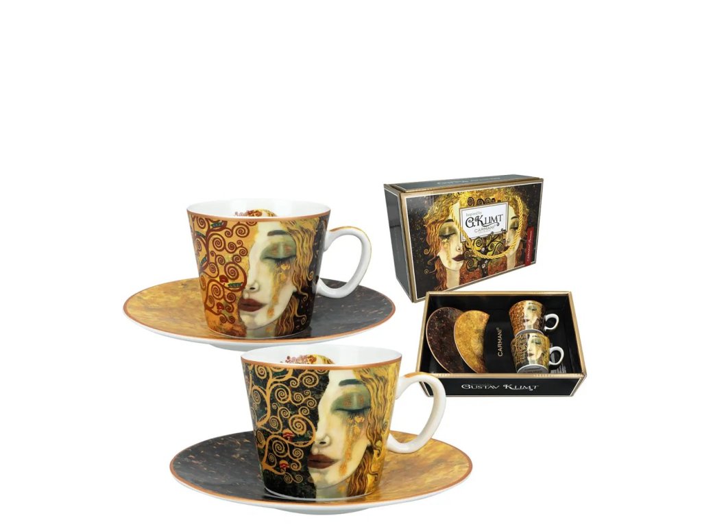 Luxusní dárkově balená souprava dvou šálků na espresso z velmi kvalitního jemného kostního porcleánu značky Carmani® v perfektním dárkovém balení. O motivu "Zlaté slzy" Tento podmanivý motiv, často vyhledávaný pod jménem Gustava Klimta, je ve skutečnosti mistrovským dílem malířky Anne-Marie Zilberman. Obraz „Zlaté slzy“ vznikl jako hluboká pocta secesnímu géniovi a dokonale si osvojil jeho estetiku – kombinuje realistickou melancholickou tvář s bohatou dekorativní texturou a zlatými plátky. Symbolika slz v podobě tekutého zlata dodává porcelánu nádech mystiky a vznešenosti, díky čemuž patří mezi nejoblíbenější vzory pro ty, kteří hledají v umění hloubku i luxus.