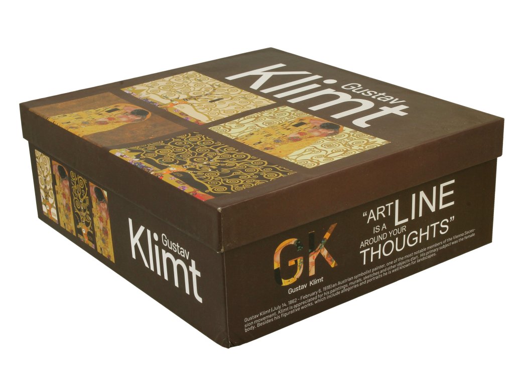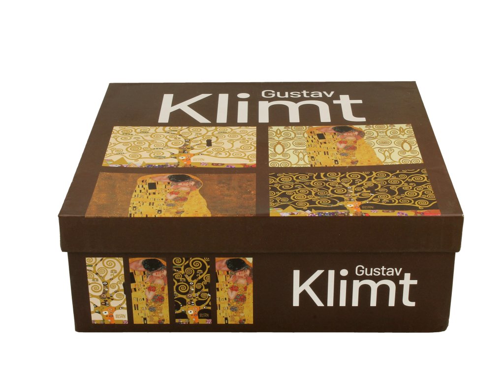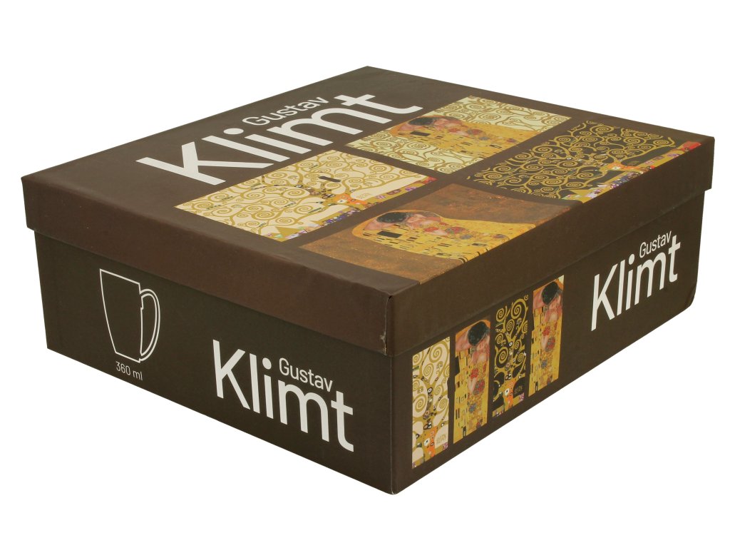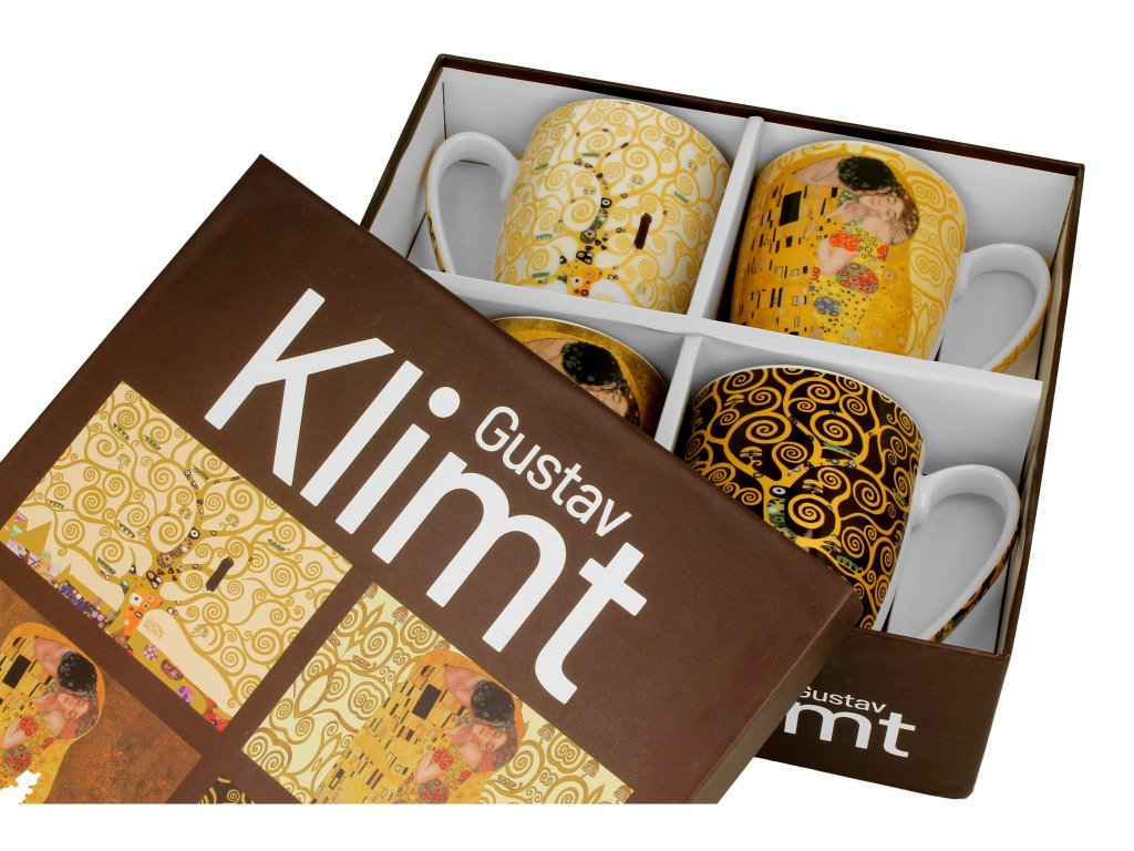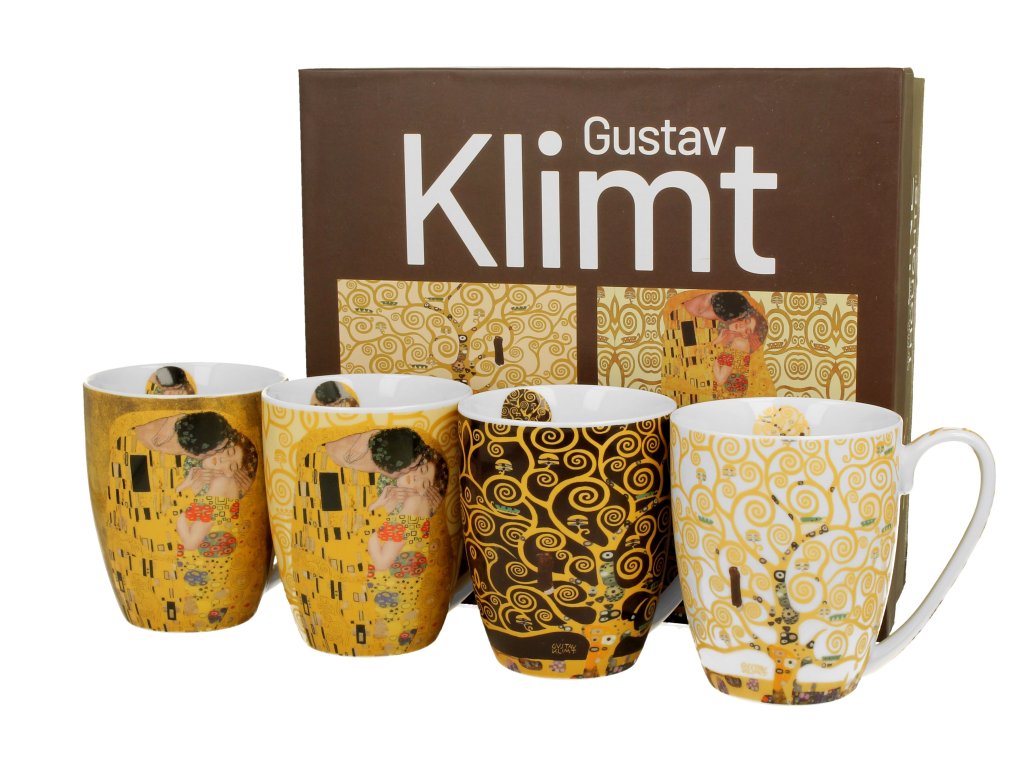 Sada čtyř klasických hrnků o objemu 360 ml inspirovaných Gustavem Klimtem, součást série Art Gallery, vyrobených z kvalitního porcelánu, který se vyznačuje přírodní krémově bílou barvou s jemným leskem a výjimečnou pevností a odolností, přičemž si zachovává lehkost a jemnost.Řada vyrobená z bílého porcelánu uvnitř zdobená reprodukcí obrazu Gustava Klimta „Polibek“ a „Strom života“. Paleta teplých hnědých a pastelových ecru odstínů v kombinaci s třpytivou zlatou dodává celku mimořádně elegantní charakter a uspokojuje vkus nejen milovníků malířského umění.Celý produkt zabalený v krabičce zdobené stejným motivem je perfektním nápadem na originální dárek, a to i pro vás samotné. Jistě vám přinese radost a připomene vám zvláštní chvíle strávené s šálkem horkého nápoje. Náš návrh není jen praktickým předmětem každodenní potřeby, ale také malým uměleckým dílem, které skvěle doplní jakýkoli interiérový styl a vnese do něj jemný akcent.Obraz „Polibek“ z roku 1908 od Gustava Klimta je považován za součást vídeňského secesního hnutí. Dílo bylo vytvořeno s použitím plátkového zlata a zobrazuje pár ztracený v láskyplném objetí, naklánějící se k polibku. Obraz patří do tzv. zlaté série, která malíři přinesla největší popularitu.Obraz „Strom života“ od Gustava je obraz, který malíř vytvořil na stěnách jídelny v paláci Stoclet v Bruselu. Klimt začal na obraze pracovat v roce 1905 a dokončil ho až v roce 1909. Obraz patří do tzv. zlaté série, tj. mozaikové dekorace zakončené plátkovým zlatem. Strom života je symbol známý téměř v každé kultuře. Kořeny ho připevňují k zemi, větve rostou nad jeho povrchem a sahají k nebi. Tímto způsobem spojuje tři prostory a ukazuje aspirace člověka. Bohatá symbolika stromu odkazuje také na mužskou a ženskou sféru.