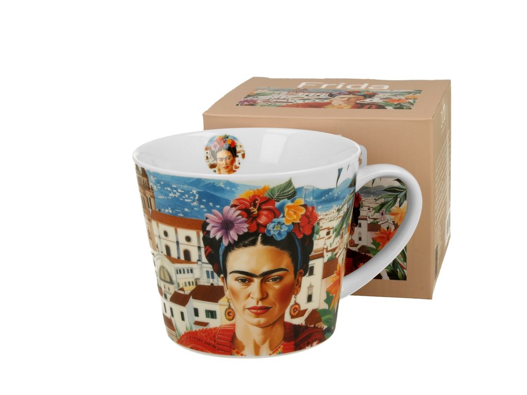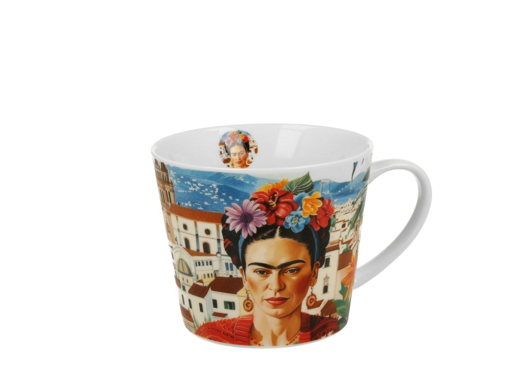 Porcelánový hrnek Frida Kahlo Vás potěší nejen při popíjení oblíbeného nápoje, ale také svým jedinečným dekorem mexické malířky z počátku 20. století Fridy Kahlo.