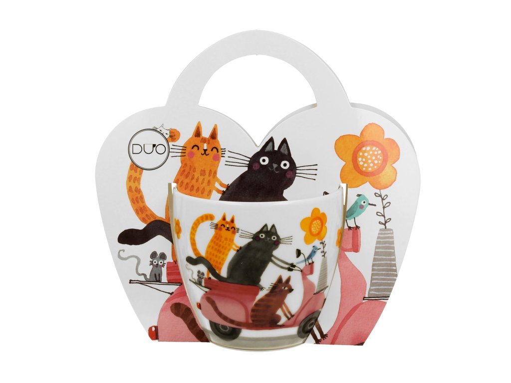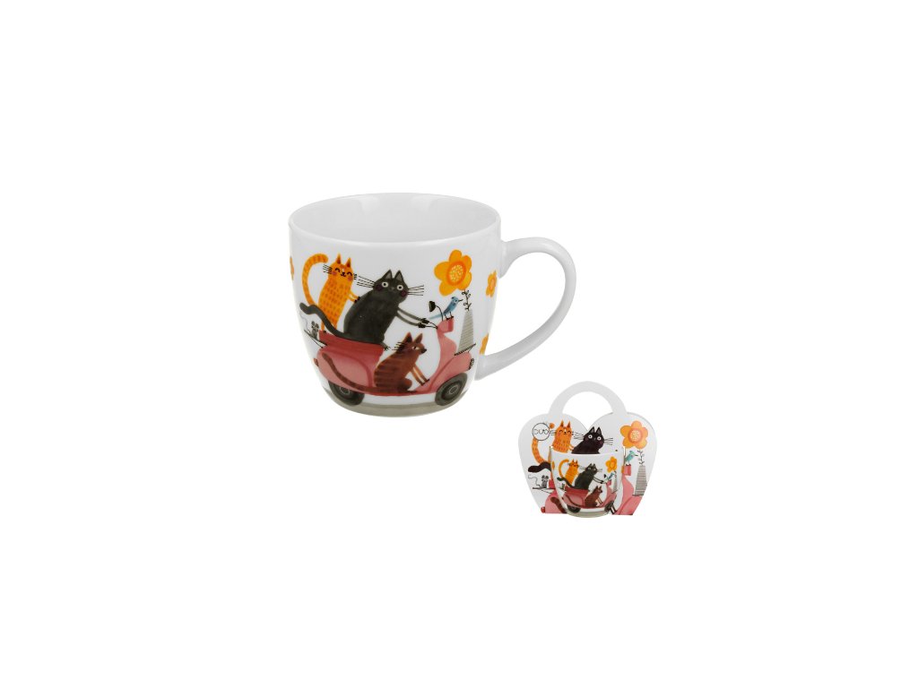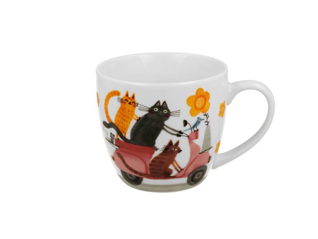 Porcelánový hrnek Kočky na skůtru si při popíjení oblíbeného nápoje snadno oblíbíte.