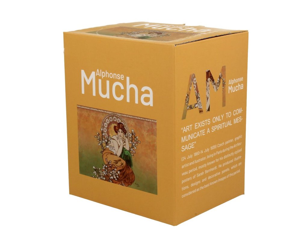Vysoký hranatý porcelánový hrnek značky DUO porcelain je idelání na latté, nebo čaj. Vhodné do myčky na nádobí i mikrovlnné trouby. Topaz je jedním z motivů ze slavné série Drahokamy (The Precious Stones), kterou vytvořil Alfons Mucha v roce 1900. V této sérii zobrazil čtyři ženské postavy jako ztělesnění vzácných kamenů – topazu, rubínu, ametystu a smaragdu. Každý obraz vyniká bohatou symbolikou, elegantní kompozicí a jemným secesním stylem, pro který je Mucha světově proslulý. Motiv Topaz zobrazuje éterickou ženskou postavu obklopenou zlatavým světlem a jemnými přírodními ornamenty. Tóny žluté, bílé a teplé béžové evokují klid, vnitřní sílu a eleganci. Tvář ženy působí jemně a vyrovnaně, přičemž celý výjev vyzařuje harmonii a noblesu. Tento motiv je ideální pro ty, kdo oceňují klasickou krásu, ženskost a nadčasový design. Produkty s tímto obrazem přinášejí do interiéru jemný dekorativní akcent a kouzlo secese.