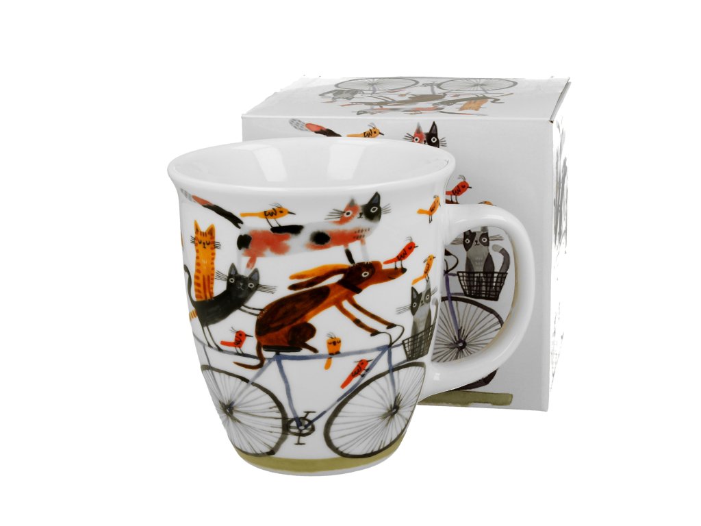 Porcelánový hrnek Pes, kočky a ptáčci na kole Vás potěší nejen při popíjení oblíbeného nápoje, ale také svým jedinečným dekorem, který díky svému objemu náležitě vynikne.