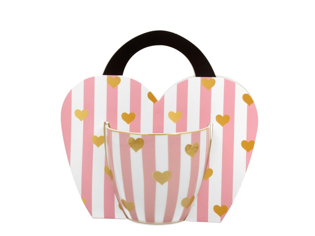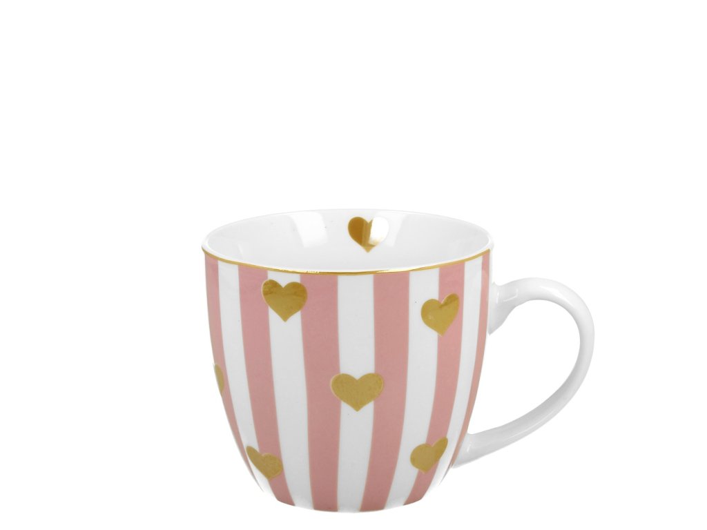 DP - Porcelánový hrnek v srdci Zlatá mini srdíčka na růžových pruzích - 460 ml