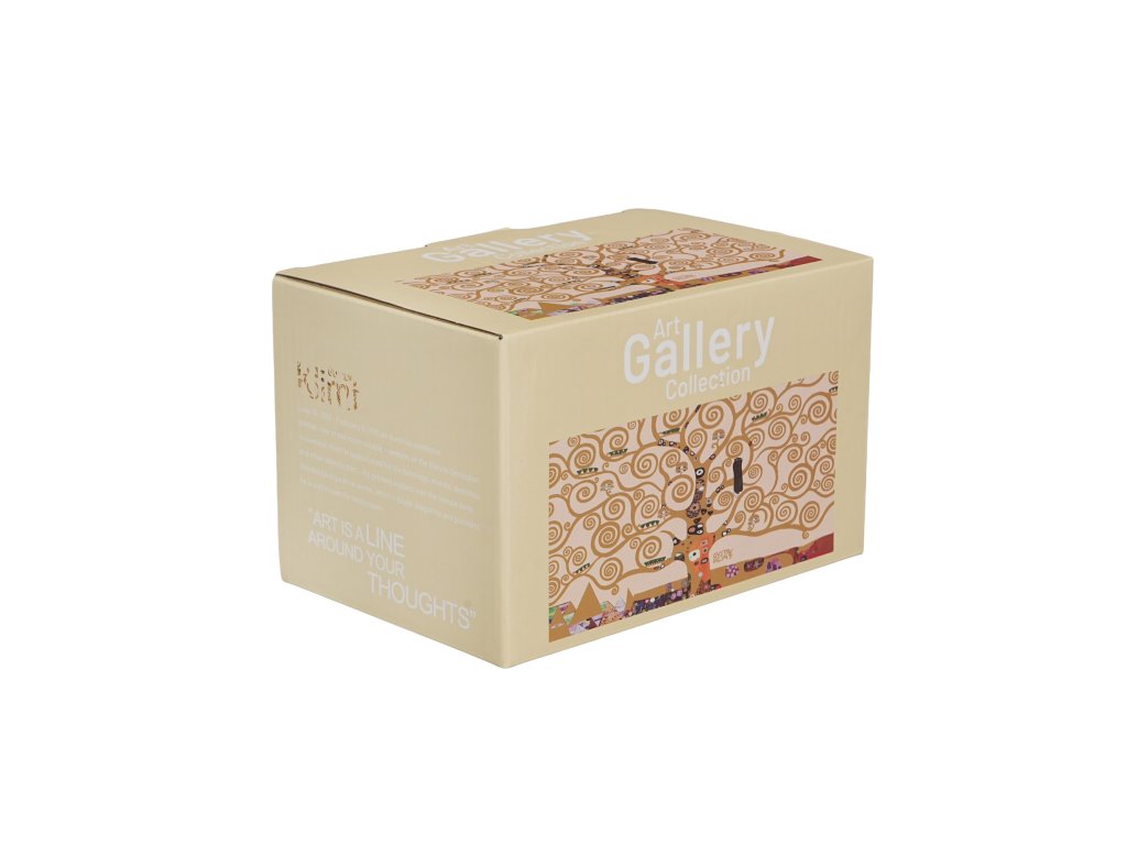 Sada dvou klasických hrnků TREE OF LIFE Ecru inspirovaných Gustavem Klimtem, součást série Art Gallery, vyrobených z porcelánu New Bone China, který se vyznačuje přírodní krémově bílou barvou s jemným leskem a mimořádnou pevností a odolností při zachování lehkosti a sofistikovanosti. Linka je vyrobena z bílého porcelánu a zdobena reprodukcí obrazu "Strom života" od Gustava Klimta. Efektní zlatě zářící vzory v kombinaci se světlým podkladem dodávají celku mimořádně elegantní charakter a uspokojí chutě nejen milovníků malby. Vše zabalené v krabičce zdobené stejným motivem je perfektním nápadem na originální dárek i pro vás. Určitě udělá radost a připomene výjimečné chvíle strávené u šálku horkého nápoje. Náš návrh je nejen praktický předmět pro každodenní použití, ale také malé umělecké dílo, které skvěle doplní každý styl interiéru a dodá mu jemný akcent. Obraz "Strom života" od Gustava je obraz, který malíř vytvořil na stěnách jídelny v paláci Stoclet v Bruselu. Klimt začal na obraze pracovat v roce 1905 a dokončil jej až v roce 1909. Obraz patří do tzv. zlaté série, tedy mozaikových dekorací zakončených plátkovým zlatem. Strom života je symbolem známým téměř v každé kultuře. Kořeny je připevňují k zemi, větve se rozprostírají nad povrchem a sahají k nebi. Spojuje tak tři prostory a ukazuje lidskou aspiraci. Bohatá symbolika stromu odkazuje i na mužskou a ženskou sféru.