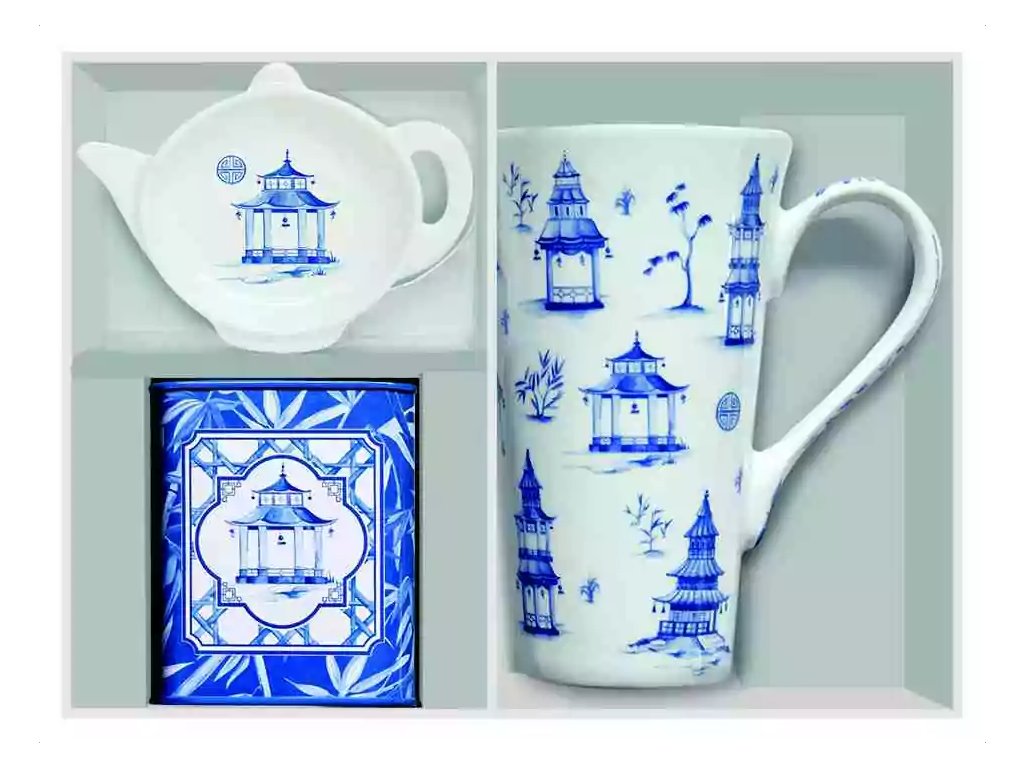 Dárkově balená souprava v japonském stylu z kolekce Pagoda italské značky Easy Life®. - s velkým porcelánovým hrnkem 600 ml - plastovou mističkou na odložení čajového sáčku - plechovou dózou na sypaný čaj Perfektní dárkové balení ve stylu designu výrobku.