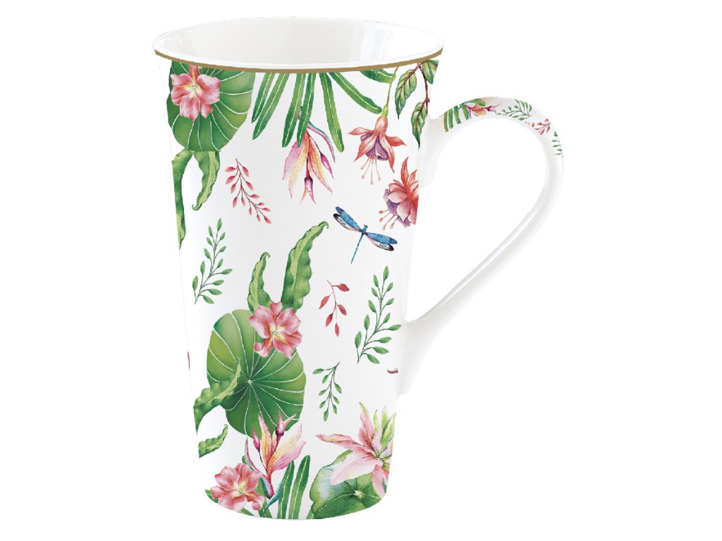 Na hrnku se vyniká detailní ilustrace rozkvetlých tropických květin. Zelená barva dodává celému designu hloubku a harmonii.
