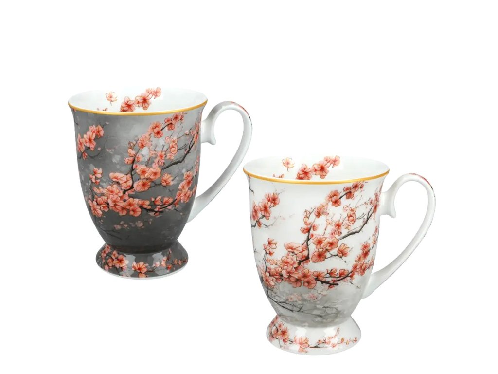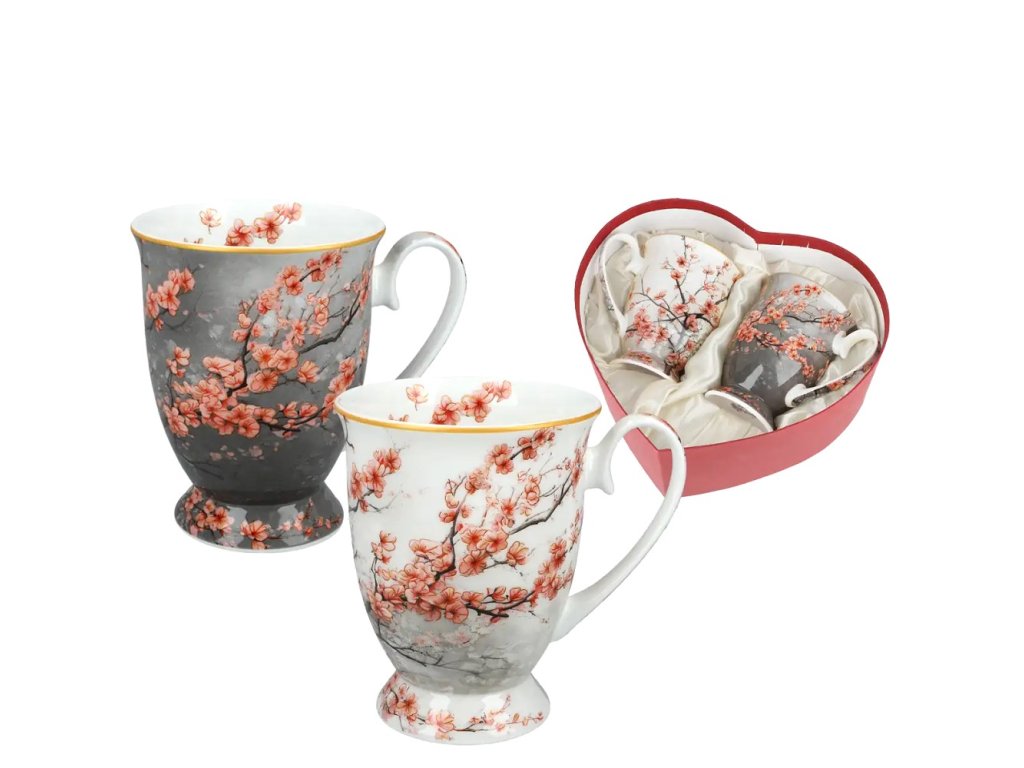 Dárková sada kvalitních porcelánových hrníčků v pevné papírové krabici ve tvaru srdce. Rostlina zobrazená na hrníčcích je třešňový květ, známý také jako sakura. Tento motiv je oblíbený zejména v japonské kultuře, kde symbolizuje pomíjivost krásy a života. Na hrníčcích je vyobrazen jemný design růžových květů na šedém a bílém pozadí, což působí velmi elegantně a romanticky — ideální jako dárek nebo dekorace pro milovníky přírody a estetiky.
