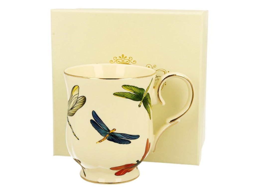 Jemný porcelán krémové barvy dekorovaný zlatou linkou. Nevhodné do myčky na nádobí a ani do mikrovlnné trouby.