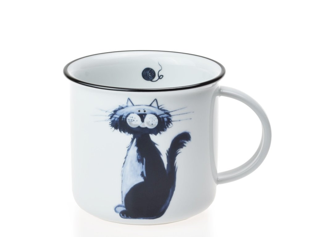 Porcelánový hrnek ve tvaru starého plecháčku z dubské porcelánky. Okraj je ručně nadekorovaný černou linkou. Lze použít v mikrovlnné troubě i myčce na nádobí.