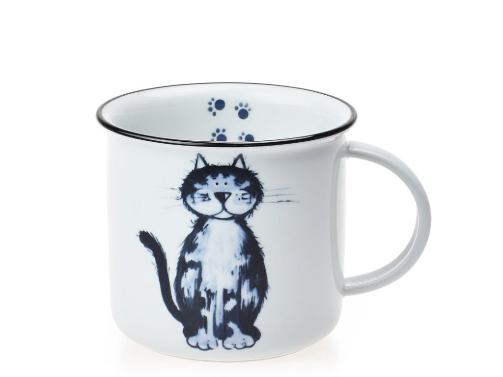 Porcelánový hrnek ve tvaru starého plecháčku z dubské porcelánky. Okraj je ručně nadekorovaný černou linkou. Lze použít v mikrovlnné troubě i myčce na nádobí.
