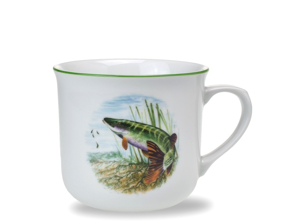 Klasický velký hrnek z dubské porcelánky s rovným dnem s rybářským dekorem. Lze použít v mikrovlnné troubě i myčce na nádobí. kvalitní glazura s vysokým leskem vysoká odolnost a životnost vyrobeno v České republice
