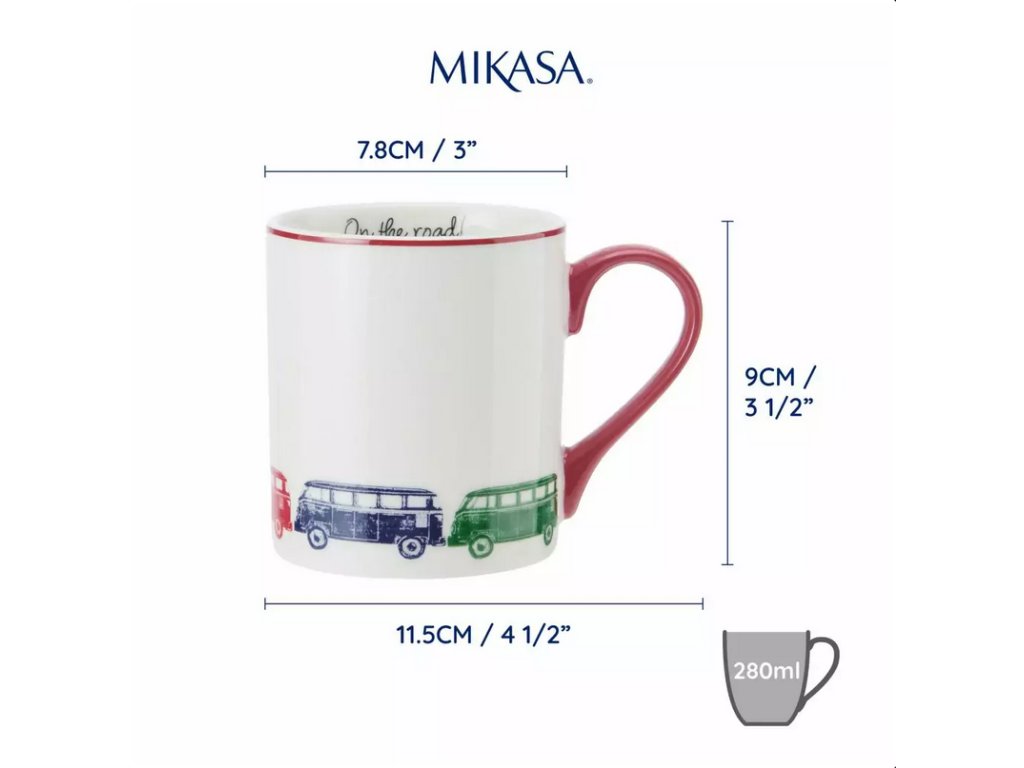 Porcelánový hrnek Mikasa Camper Van je kombinací stylu, kvality a praktičnosti. Je ideální pro každodenní použití, hodí se do každé kuchyně a zároveň je skvělým dárkem. Barevné motivy multivanů přinesou do vašeho dne trochu radosti a připomenou vám cestovatelského ducha.