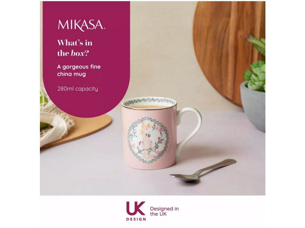 Tento porcelánový hrnek Mikasa Cockatoo je dokonalým doplňkem sbírky každého milovníka papoušků. Je to atraktivní hrnek s realistickou ilustrací papouška na růžové barvě. Tento hrnek s potiskem a zlatým lemem po okraji je vyroben z odolného porcelánu. Vzhledem k povaze designu doporučujeme mýt v ruce. Tento neotřelý hrnek je ideální nejen pro doplnění vaší kuchyně, ale je také okouzlujícím dárkem pro, milovníky přírody. Hrnek je dodáván v krásné dárkové krabičce, takže je bezproblémovým dárkem pro každou příležitost. Objem je 280 ml.
