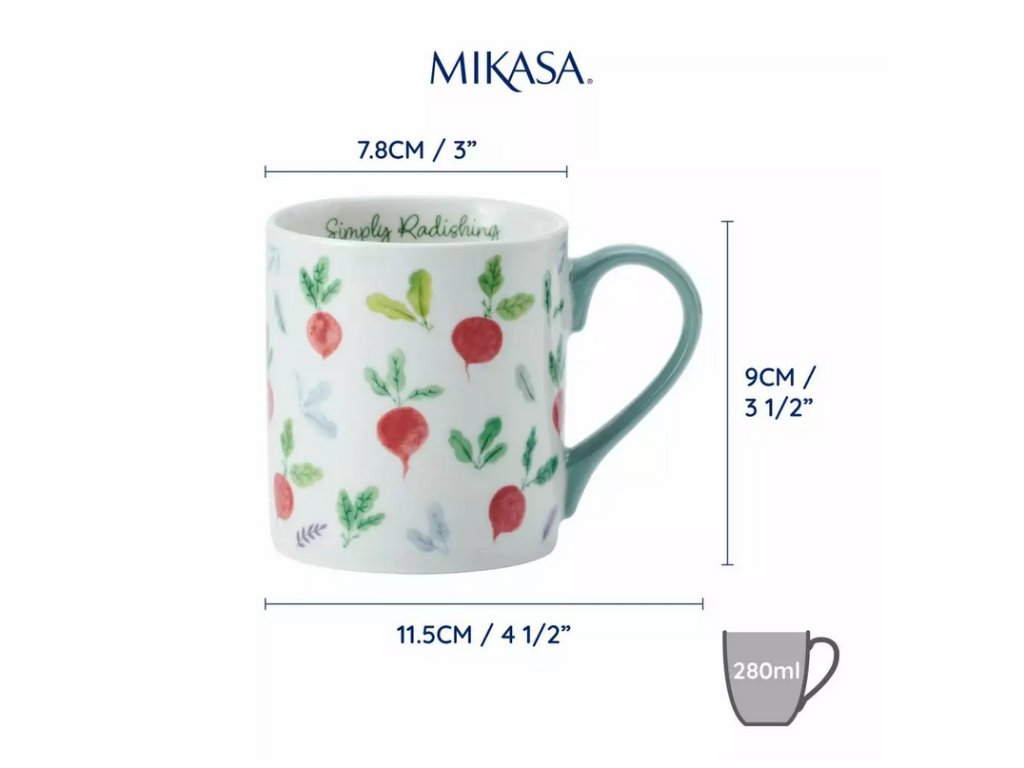 Porcelánový hrnek Mikasa Radish je dokonalým doplňkem pro každého, kdo si rád užívá krásu přírody i ve své kuchyni. S motivy ředkviček na čistě bílé porcelánové ploše přináší do vašeho domova svěžest a hravost. Tento hrnek není jen praktickým nástrojem, ale také estetickým kouskem, který potěší oko i duši.