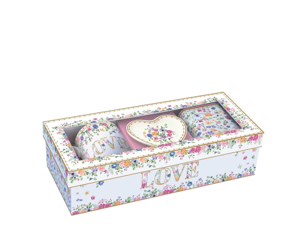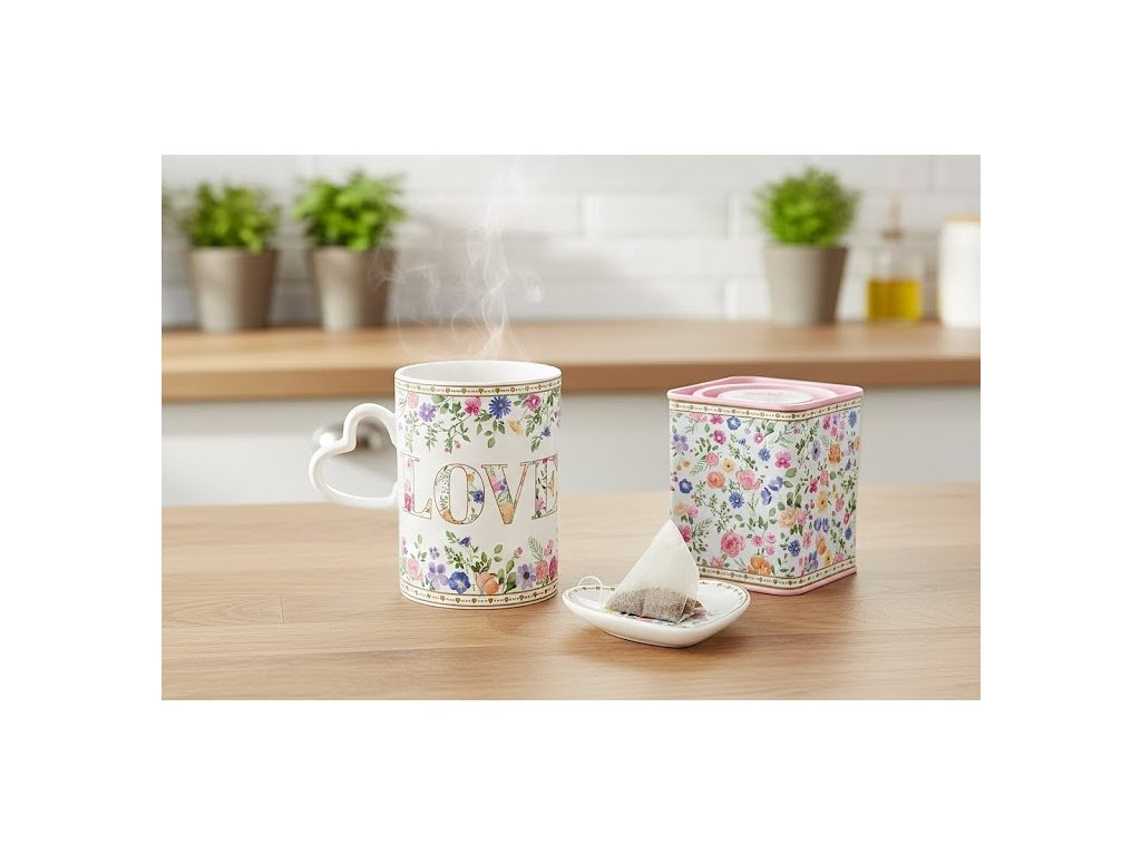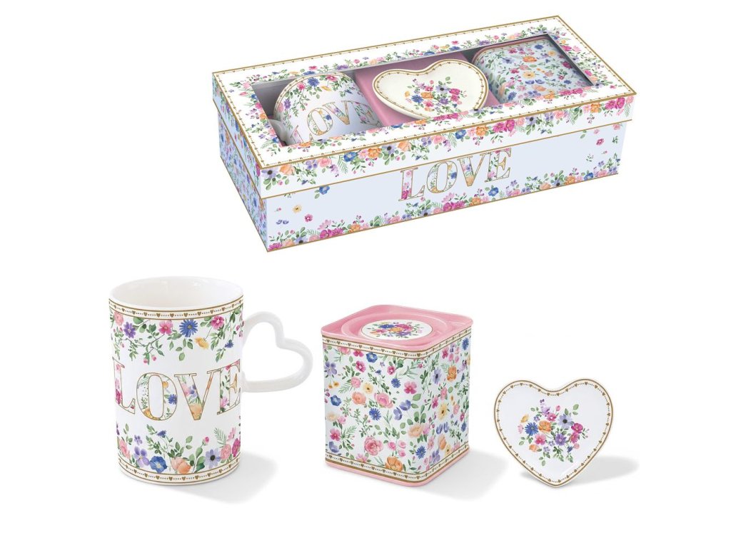 Romantický souprava s hrnkem, plechovkou na sypaný čaj a mističkou srdíčkem - Easy Life - Kvetoucí láska