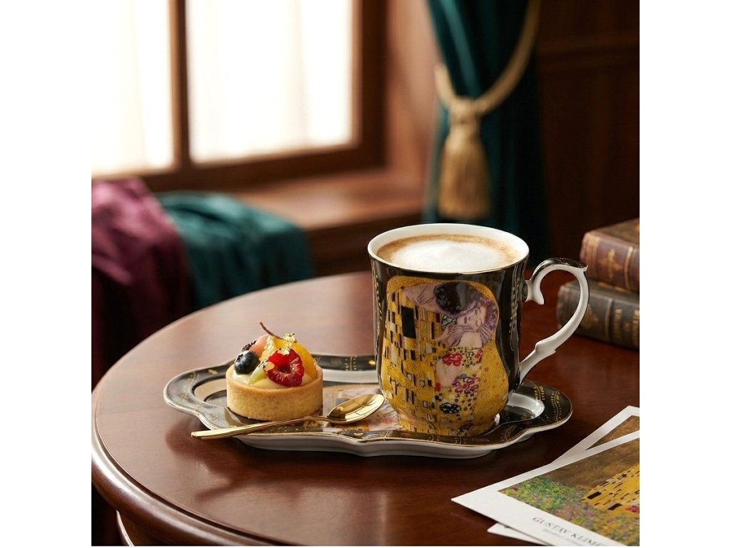 Káva a dezert v jednom: Set s motivem Gustav Klimt Proč hledat zvlášť talířek na zákusek, když ho můžete mít rovnou u hrnku? Tento elegantní porcelánový set spojuje umění s praktičností. Hrnek o objemu 350 ml je svou velikostí ideální na odpolední čaj nebo větší kávu (lungo, cappuccino). To hlavní kouzlo se však skrývá v podšálku. Díky unikátnímu rozměru 22 x 11 cm a prodlouženému tvaru nabízí vedle hrnku dostatek místa pro odložení lžičky a servírování croissantu, sušenek nebo malého dortíku. Nemusíte tak špinit další nádobí. Celý set zdobí slavný motiv „Polibek“ (The Kiss) od Gustava Klimta v luxusním provedení se zlatými detaily. Nelze použít v mikrovlnné troubě a ani v myčce na nádobí.