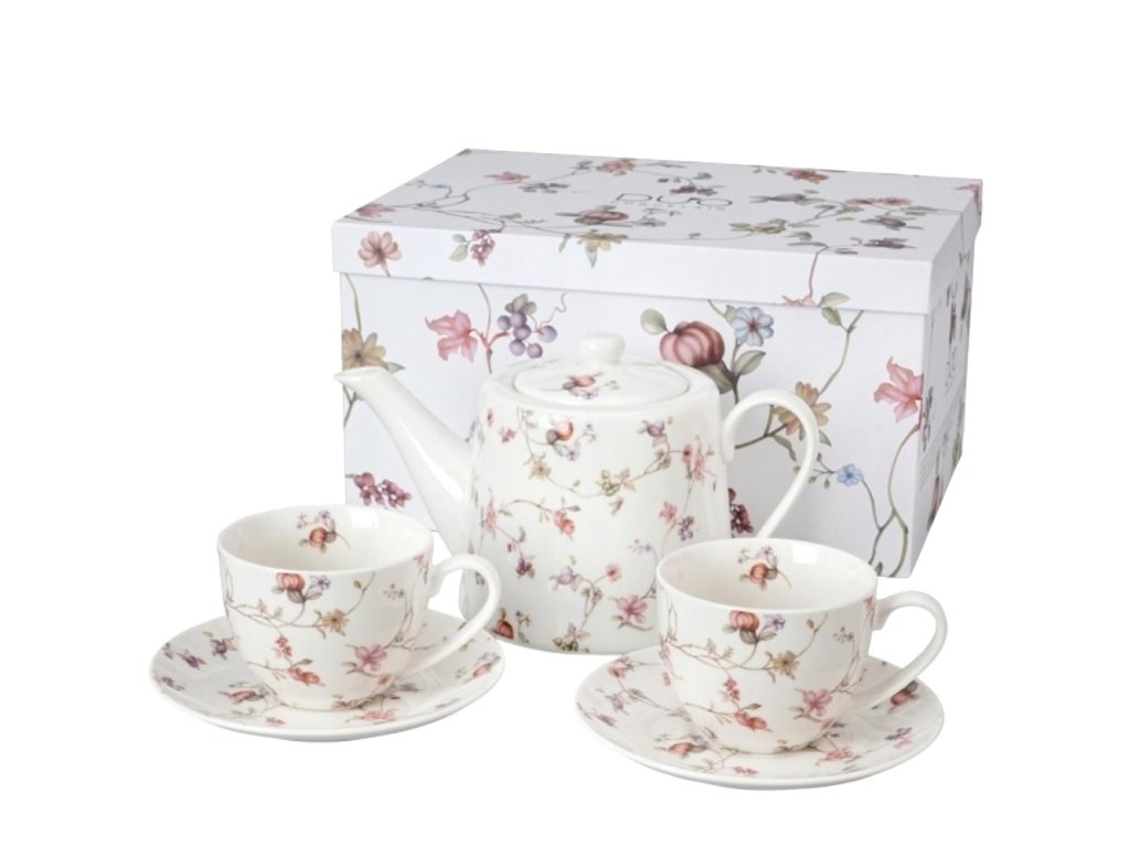 Dárkově balená porcelánová čajová souprava pro dvě osoby značky DUO porcelain. Souprava obsahuje konvici o objemu 900 ml s nerezovým sítkem na bylinky a 2 kusy šálků s podšálkem. Vhodné do myčky na nádobí i mikrovlnné trouby.
