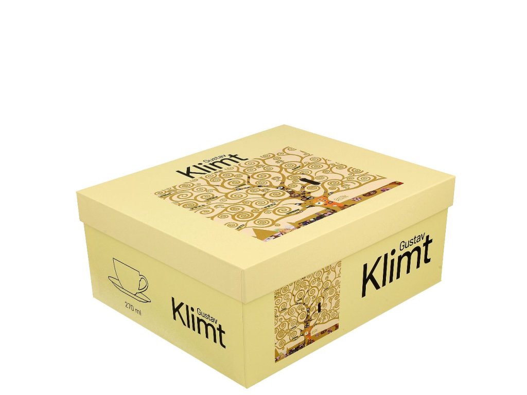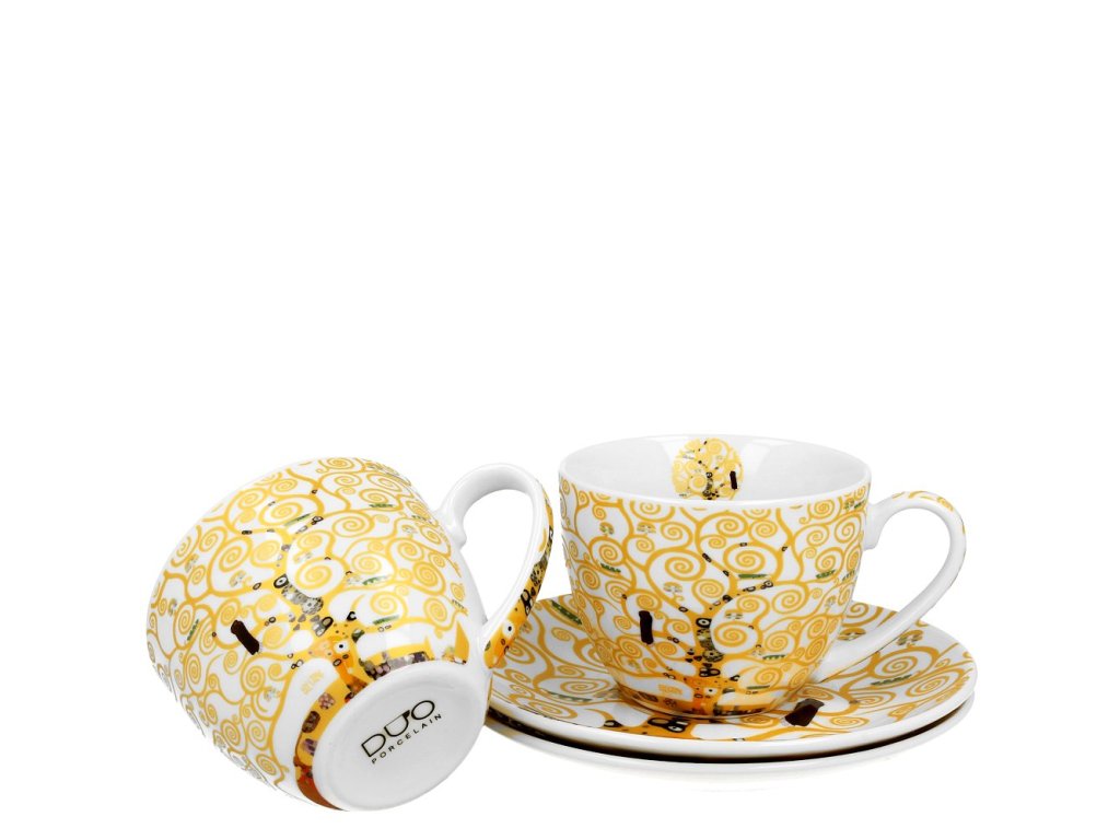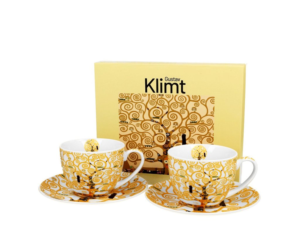Dva středně velké porcelánové šálky s podšálkem s dekorem Gustav Klimt Strom života white ideální na lungo, čaj, horkou čokoládu. Vhodné do myčky na nádobí i mikrovlnné trouby.