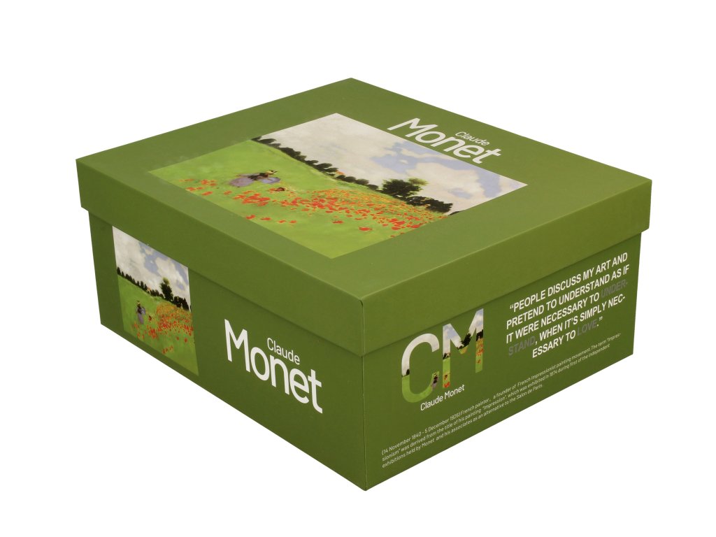 Sada dvou 280 ml šálků s podšálky POPPY FIELD C. Monet ze série Art Gallery, vyrobená z kvalitního porcelánu, vyznačující se elegantní a přírodní krémově bílou barvou s jemným leskem i mimořádnou odolností při zachování lehkosti a pochoutka. Linka z bílého porcelánu uvnitř zdobená fragmentem reprodukce obrazu „Vlčí máky u Argenteuil“ od Claudy Moneta. Okouzlující a jemný obraz v pastelových barvách uspokojí vkus nejen milovníků malířského umění. Celé je to zabaleno v ozdobné krabičce zdobené stejným motivem, je to skvělý nápad na originální dárek nejen pro milovníky umění a malby. Poppies u Argenteuil z roku 1873 je jedním z nejznámějších obrazů francouzského impresionisty. Umělec opět představuje své oblíbené téma - plenér, kde volně ukazuje pohyb při zachování klidu idylické atmosféry. Obraz ukazuje jeho manželku a syna poblíž jejich domova v Argenteuil. Stejně jako v mnoha jiných dílech Moneta je Camilla kreslená s deštníkem v rukou a jeho ladné obrysy dodávají obrazu zvláštní kouzlo. V současné době je obraz vystaven v muzeu Orsay v Paříži.