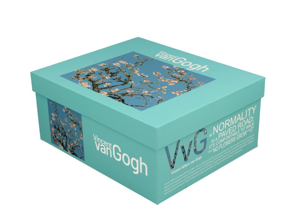 Dva šálky s podšálky Květ mandle inspirovaný V. van Goghem ze série Art Gallery, vyrobené z kvalitního porcelánu, vyznačující se elegantní a přírodní krémově bílou barvou s jemným leskem a výjimečnou odolností při zachování lehkosti a jemnosti.Řada je vyrobena z bílého porcelánu, uvnitř zdobená reprodukcí van Goghovho obrazu "Kvetoucí mandloň". Tlumené barvy jemné modré a jemné bílé vytvářejí z nádobí harmonickou kombinaci klasiky a moderního.Celý produkt zabalený v krabičce zdobené stejným motivem je perfektním nápadem na originální dárek, i pro vás samotné. Jistě vám přinese radost a připomene vám zvláštní chvíle strávené s šálkem horkého nápoje. Náš návrh není jen praktickým předmětem každodenní potřeby, ale také malým uměleckým dílem, které skvěle doplní jakýkoli styl interiéru a vnese do něj jemný akcent.Obraz "Květ mandle" z roku 1890 od Vincenta van Gogha je jedním z autorem nejcennějších díky svému rodinnému charakteru. Umělec dílo namaloval pro svého novorozeného synovce, kterého na jeho počest pojmenoval Vincent. Vzor na obraze je také odrazem van Goghovy fascinace japonským uměním.