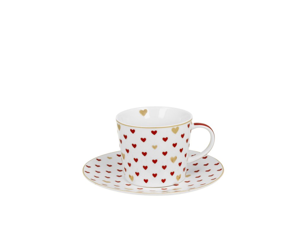 Šálek s podšálkem RED HEARTS, součást série HEARTS, je vyroben z porcelánu New Bone China, který se vyznačuje elegantní a přírodní krémově bílou barvou s jemným leskem a také výjimečnou odolností. Šálek je zdoben drobnými srdíčky v zářivě červené a zlaté barvě na bílém pozadí. Zabalený v ozdobné krabičce se stejným motivem je perfektním nápadem na jedinečný dárek pro každou milovanou osobu – nejen na Valentýna.