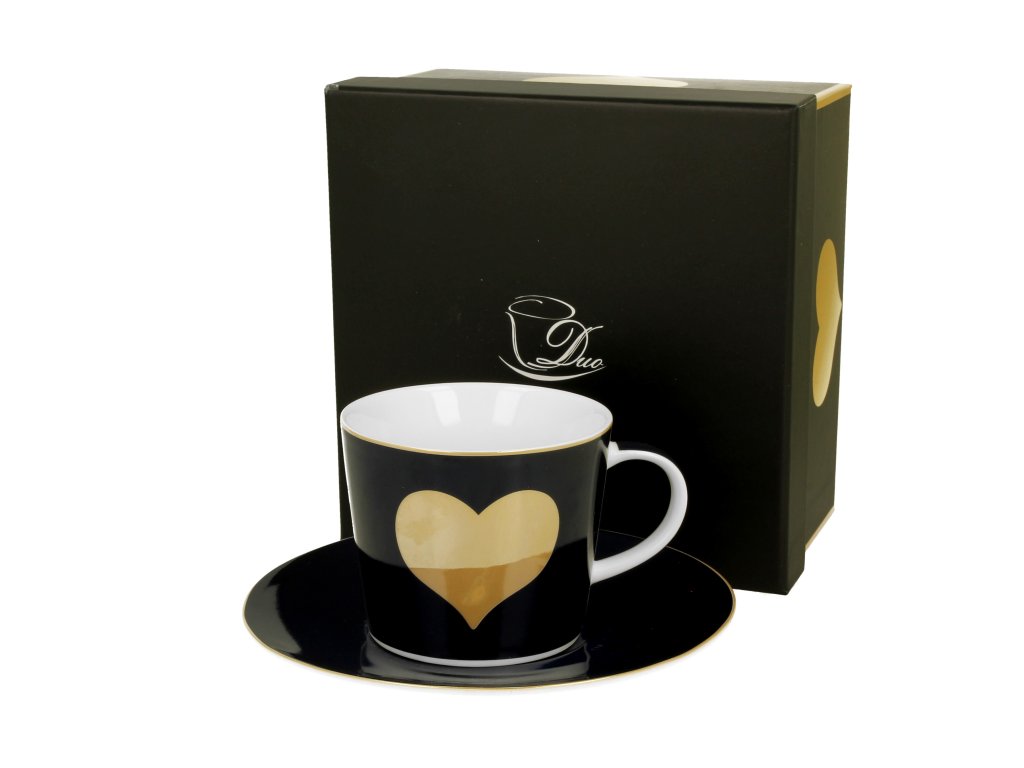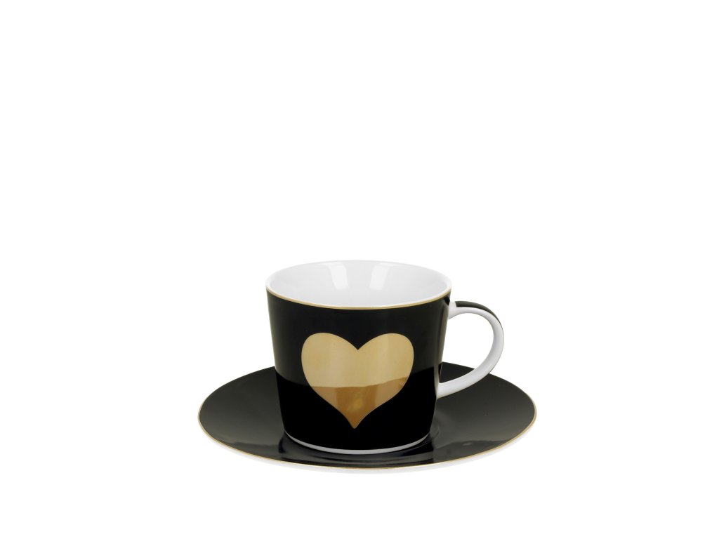 DP - Porcelánový šálek s podšálkem Zlaté srdce na černém podkladu - 250 ml