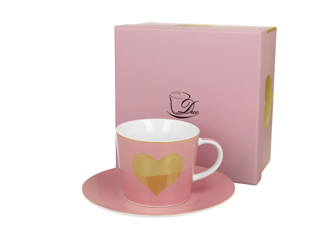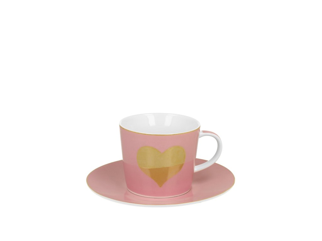 DP - Porcelánový šálek s podšálkem Zlaté srdce na růžovém podkladu - 250 ml