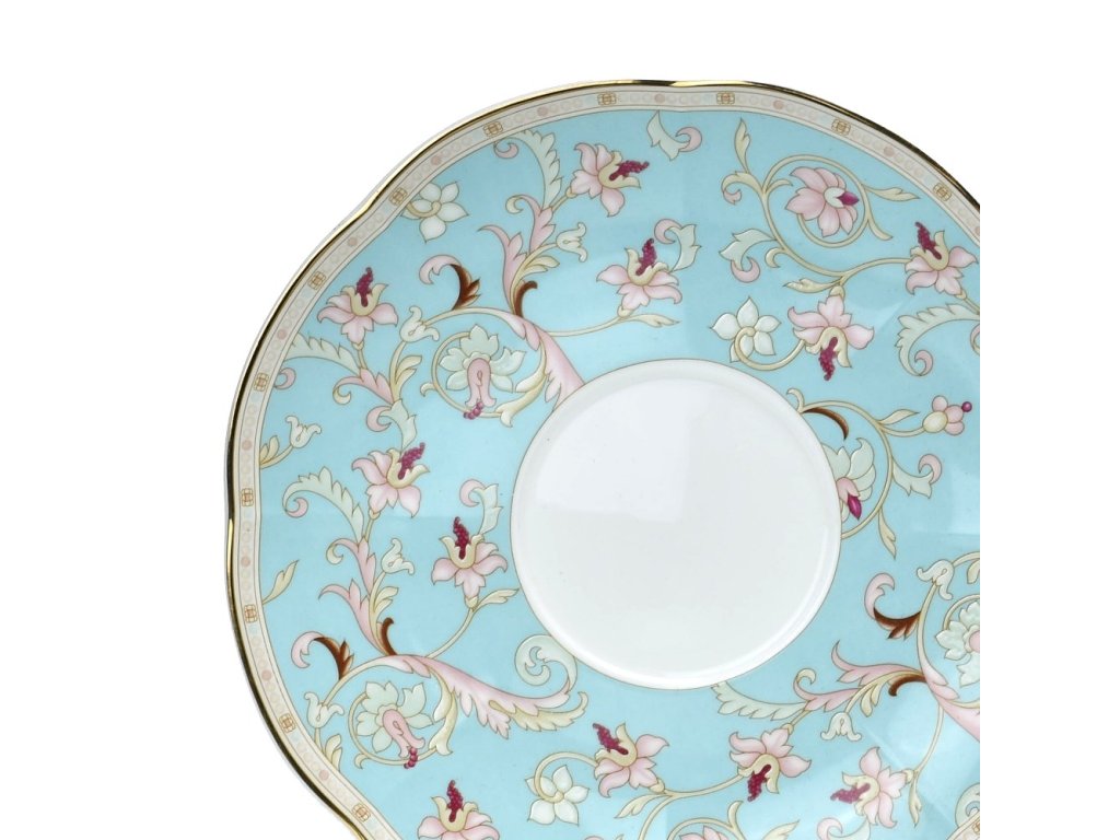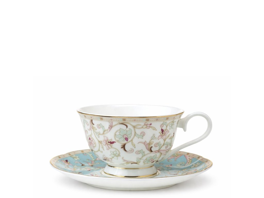 Luxusní porcelánový šálek s podšálkem na čaj s jemným květinovým dekorem se zlatou linkou. Šálek i podšálek je vyrobený z velmi lehkého a na světle průhledného kostního porcelánu. Nedoporučujeme používat v myčce na nádobí a ani v mikrovlnné troubě.