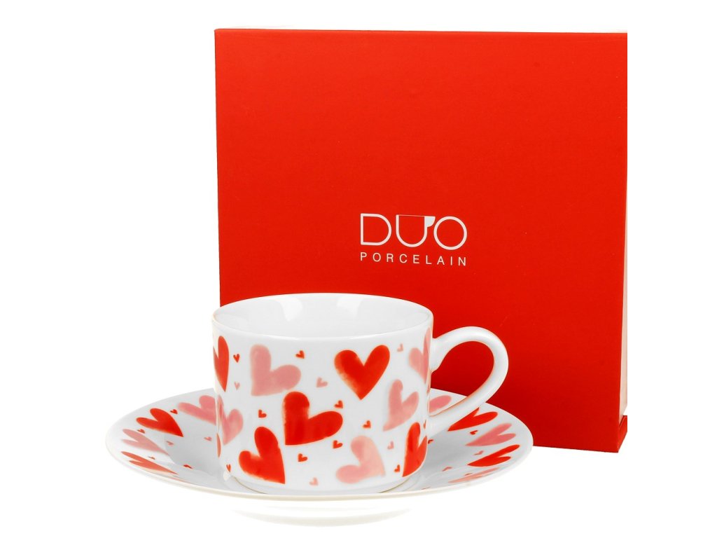 Porcelánový šálek s podšálkem střední velikosti na lungo, nebo čaj s milým dekorem v pěkné pevné dárkové krabičce. Vhodné do myčky na nádobí i mikrovlnné trouby.