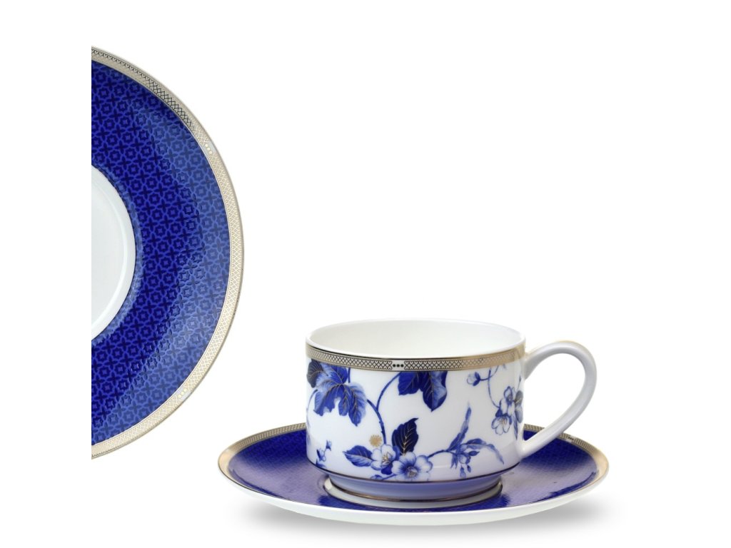 Luxusní porcelánový šálek s podšálkem s dekorem modrých květin s jemnou platinovou linkou. Šálek i podšálek je vyrobený z velmi lehkého a na světle průhledného kostního porcelánu. Nedoporučujeme používat v myčce na nádobí a ani v mikrovlnné troubě.