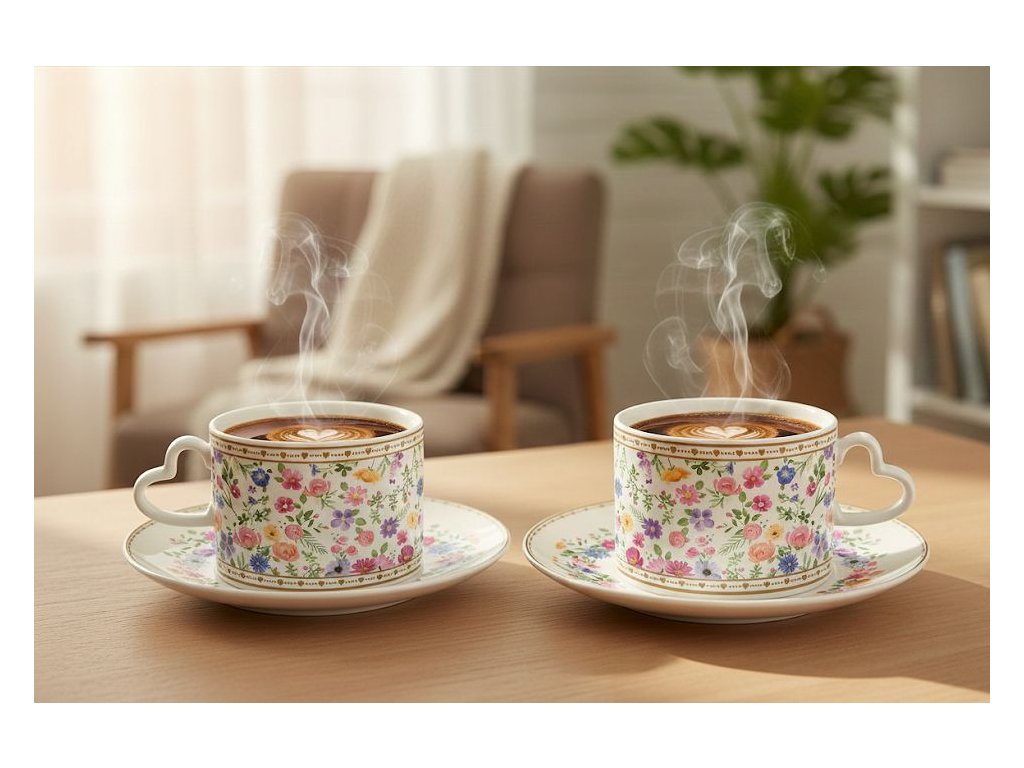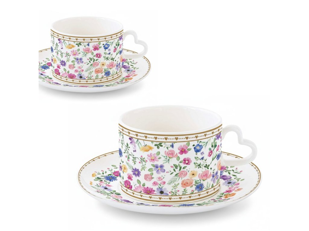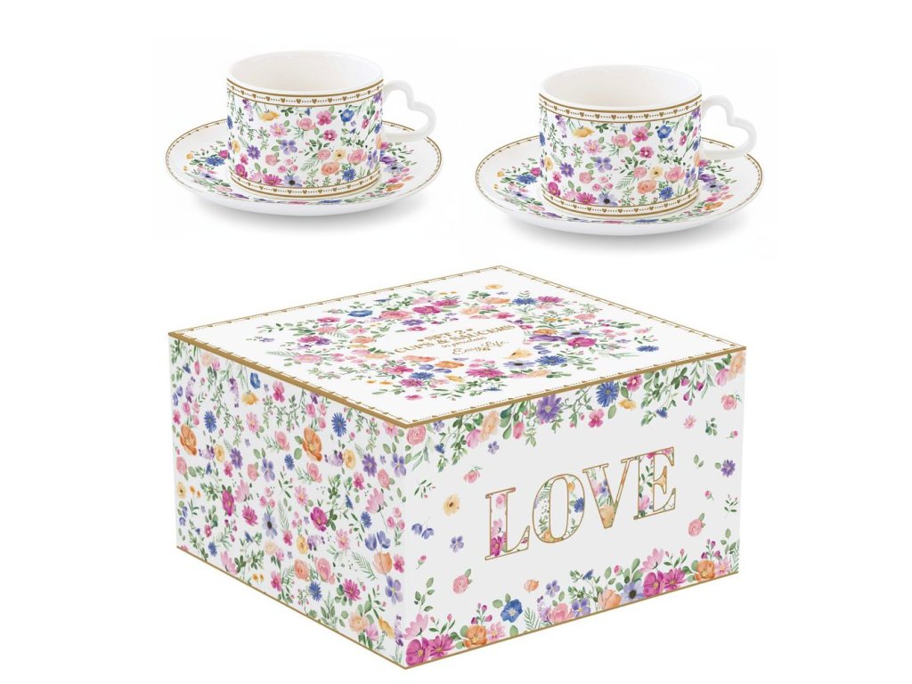 Souprava dvou šálků s podšálkem s půvabným květinovým dekorem a porcelánovým ouškem vymodelovaným do tvaru srdce italské značky Easy Life®. Perfektní dárkové balení ve stylu designu výrobku. Vhodné do myčky na nádobí i mikrovlnné trouby.