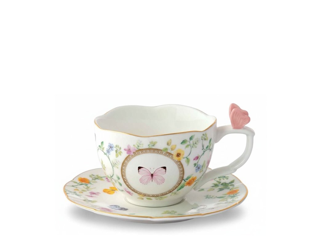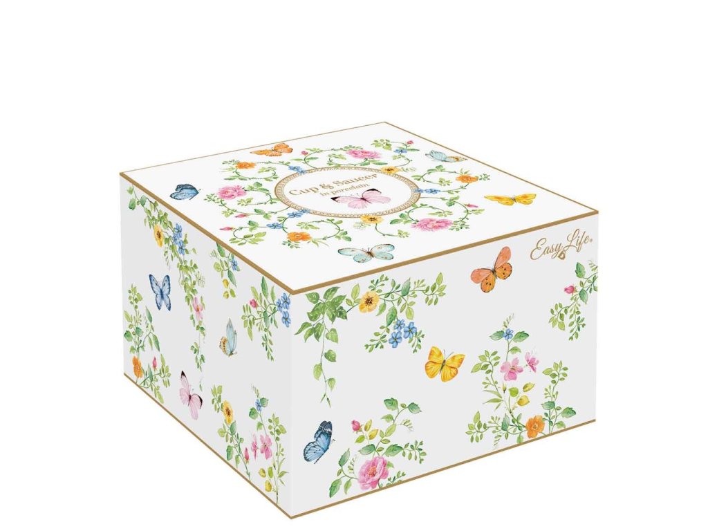 Porcelánový šálek s podšálkem na čaj, kávu s bohatou květinovou dekorací s motýly z kolekce Dancing Butterflies italské značky Easy Life®. Perfektní dárkové balení ve stylu designu výrobku. Okraj je ručně dekorovaný zlatou linkou Nehodné do myčky na nádobí a ani do mikrovlnné trouby.