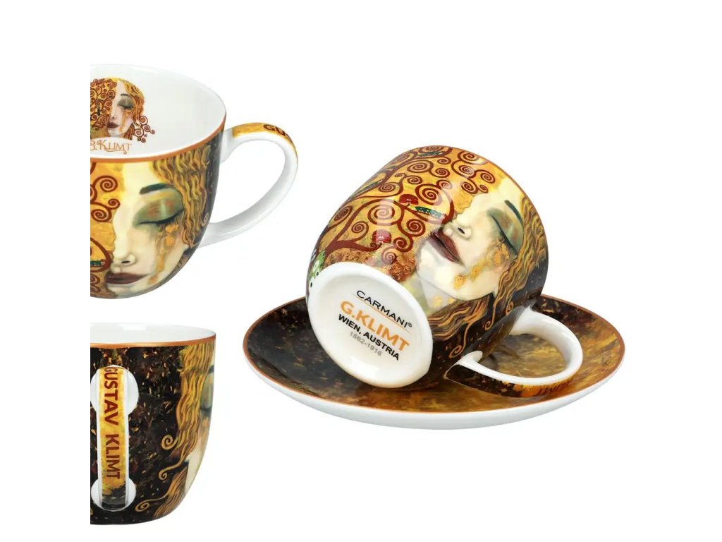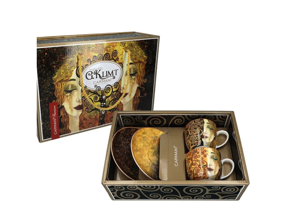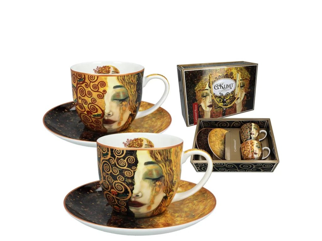 Souprava dvou větších šálků s podšálkem z velmi kvalitního porcelánu značky Carmani® v perfektním dárkovém balení. O motivu "Zlaté slzy" Tento podmanivý motiv, často vyhledávaný pod jménem Gustava Klimta, je ve skutečnosti mistrovským dílem malířky Anne-Marie Zilberman. Obraz „Zlaté slzy“ vznikl jako hluboká pocta secesnímu géniovi a dokonale si osvojil jeho estetiku – kombinuje realistickou melancholickou tvář s bohatou dekorativní texturou a zlatými plátky. Symbolika slz v podobě tekutého zlata dodává porcelánu nádech mystiky a vznešenosti, díky čemuž patří mezi nejoblíbenější vzory pro ty, kteří hledají v umění hloubku i luxus.