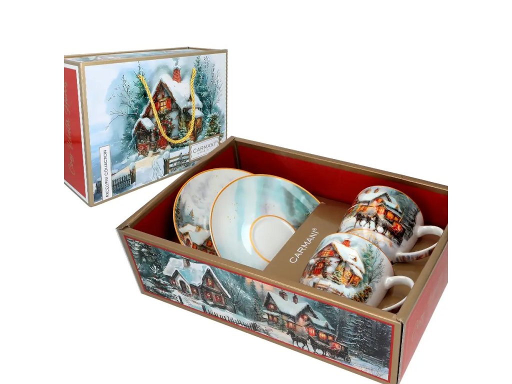 Luxusní šálky s podšálkem z tenkostěnného porcelánu značky Carmani® s vánoční dekorací. Perfektní dárkové balení v pevné krabici s potiskem opatřené úchyty.
