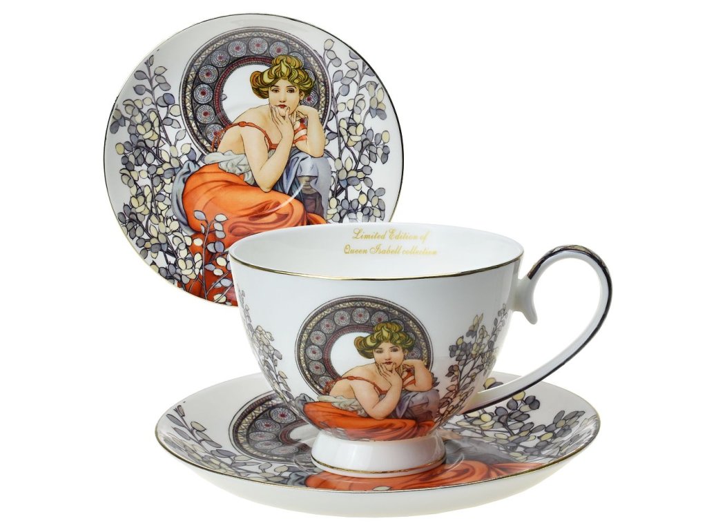 Exkluzivní vysoce kvalitní tenký porcelánový set "New bone" s fascinujícím replikou díla slavného českého malíře Alfonse Muchy. Sada se skládá ze dvou porcelánových šálků a podšálků a je zabalena v dárkové krabičce.