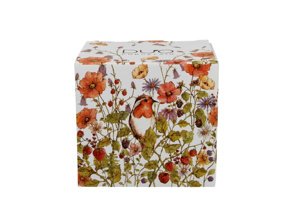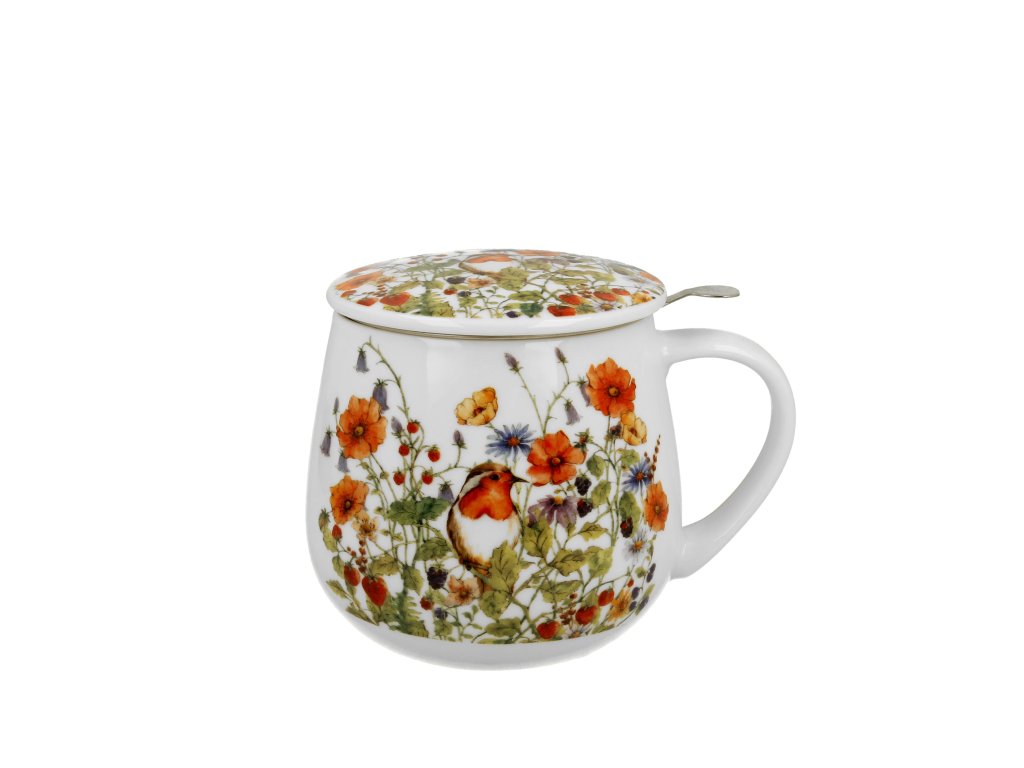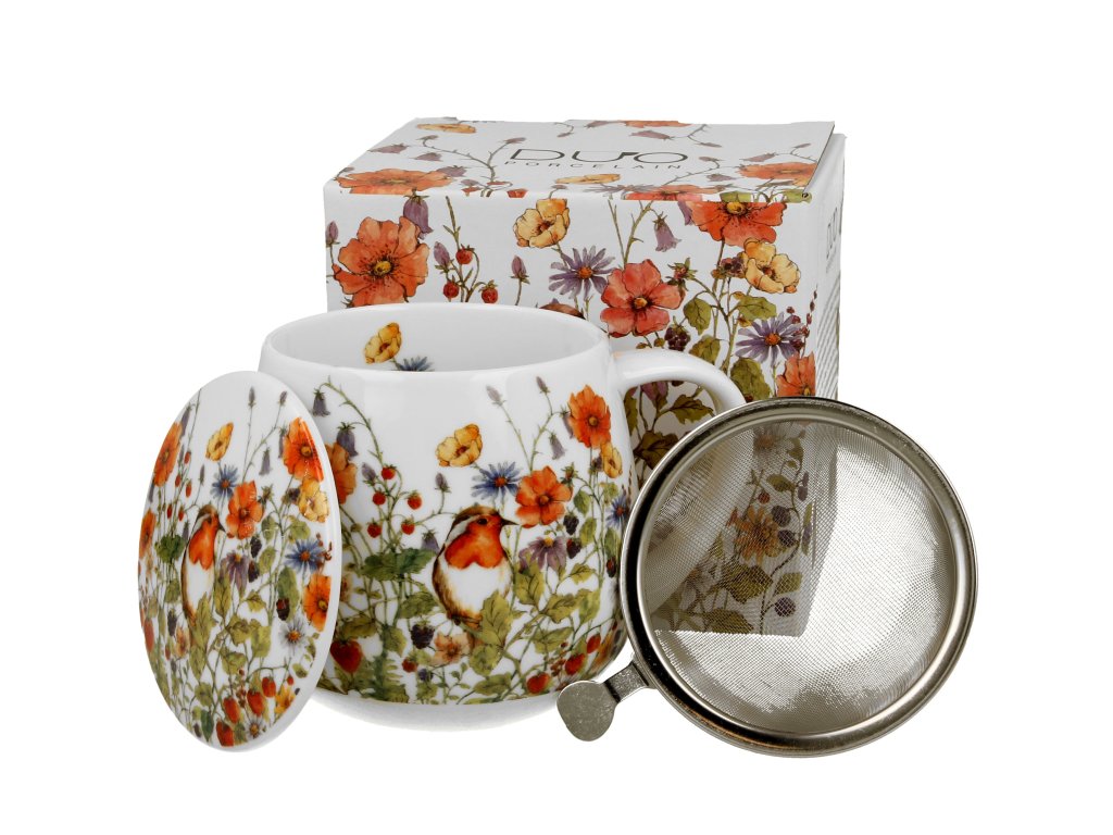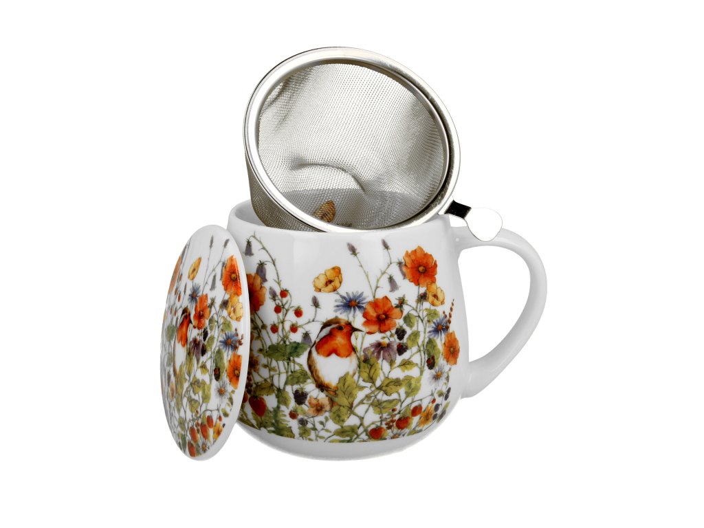 Porcelánový dekorovaný hrnek o objemu 430 ml s porcelánovým víčkem a kovovým sítkem na sypaný čaj v dekorované krabičce potěší všechny milovníky přírody obzvláště lučního kvítí a ptáčků. Doporučujeme jako krásný a jedinečný dárek pro vaše blízké.
