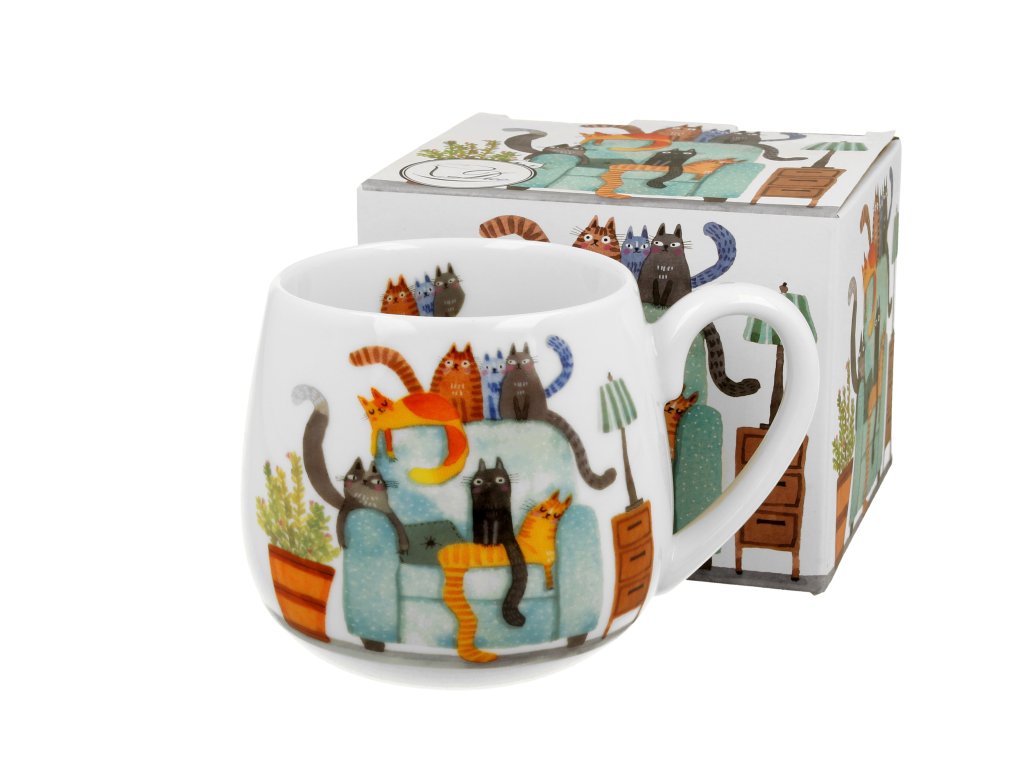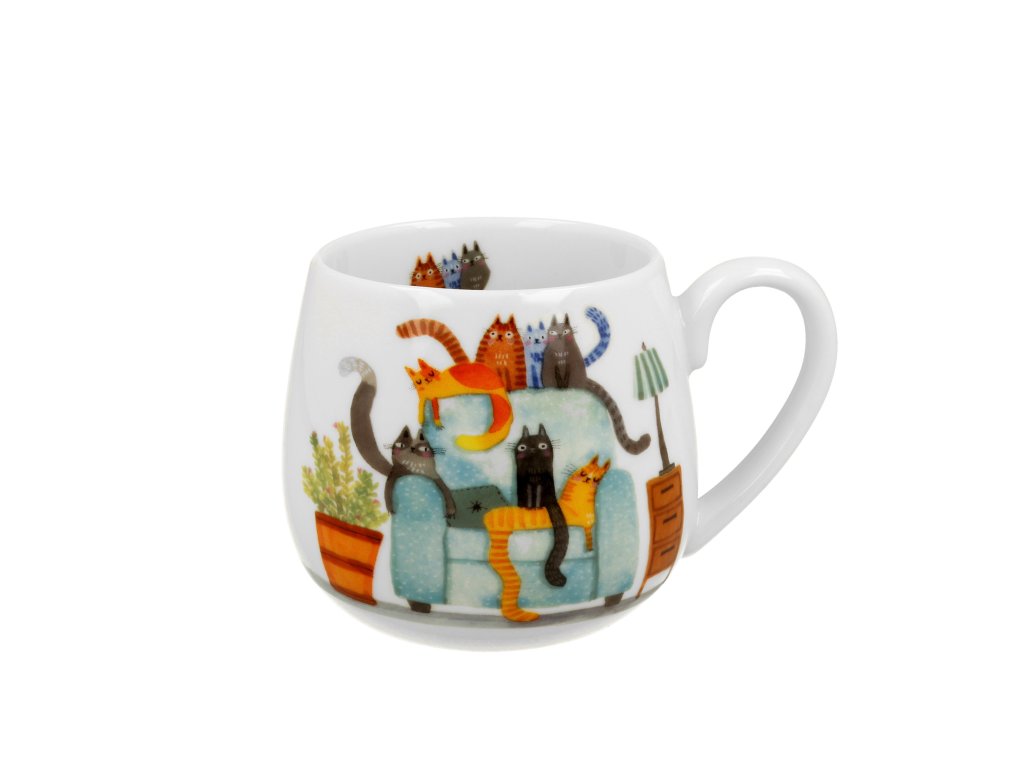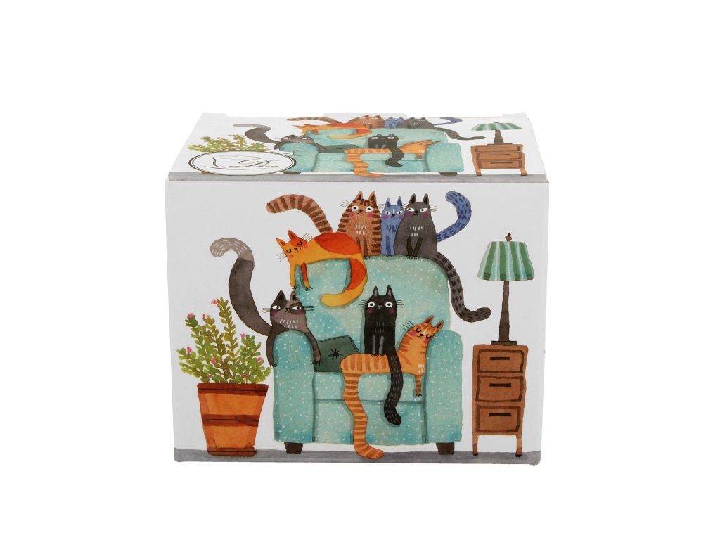 Porcelánový hrnek barylka KOČKY na křesle součást série Animals, vyrobený z kvalitního porcelánu, charakterizovaný přírodní krémově bílou barvou s jemným leskem a výjimečnou pevností a odolností, přičemž si zachovává lehkost a jemnost.Řadu zdobí motiv vícebarevných, nadýchaných a kulatých domácích koček relaxujících na obrovském křesle. Šťavnaté barvy v kombinaci s hravou atmosférou vytvářejí zdařilou kompozici.Celý produkt zabalený v dekorativní krabičce zdobené stejným motivem je skvělým nápadem na originální dárek pro každou příležitost.