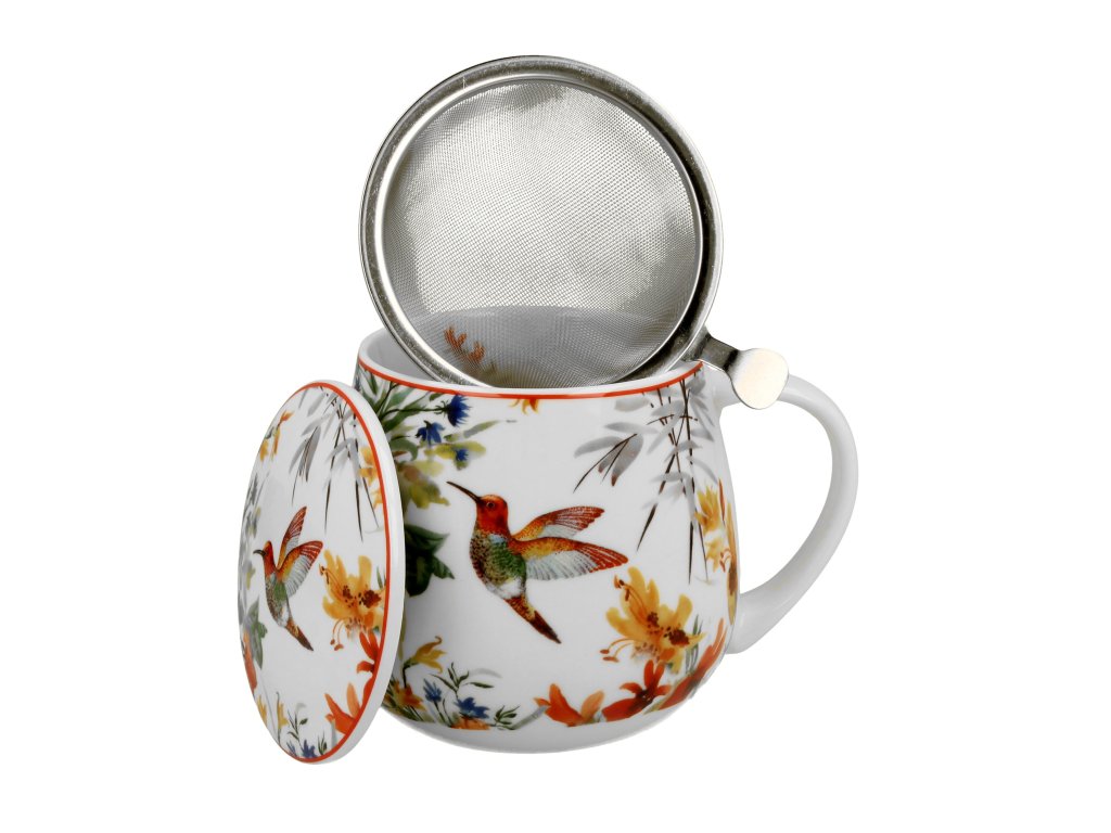 DG - Porcelánový hrnek Barylka LINNEA Ptáček Kolibřík s víčkem a kovovým sítkem v dárkové krabičce - 430 ml