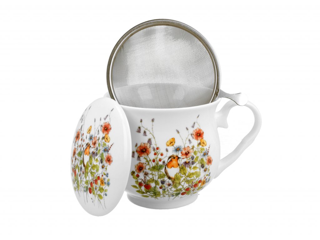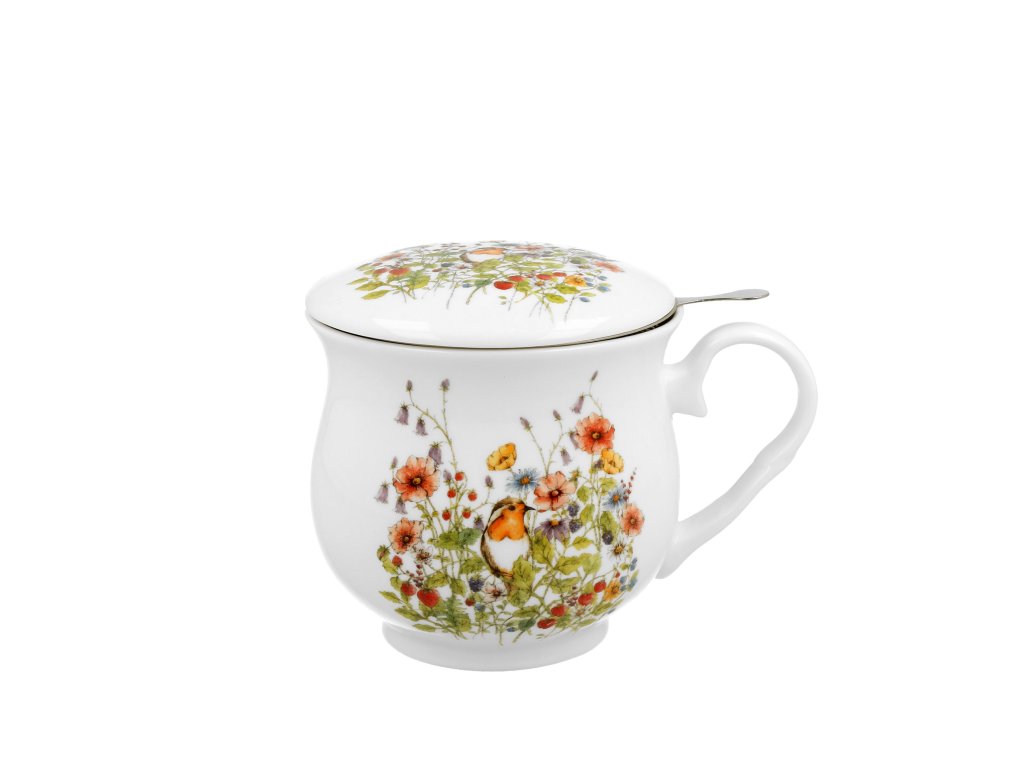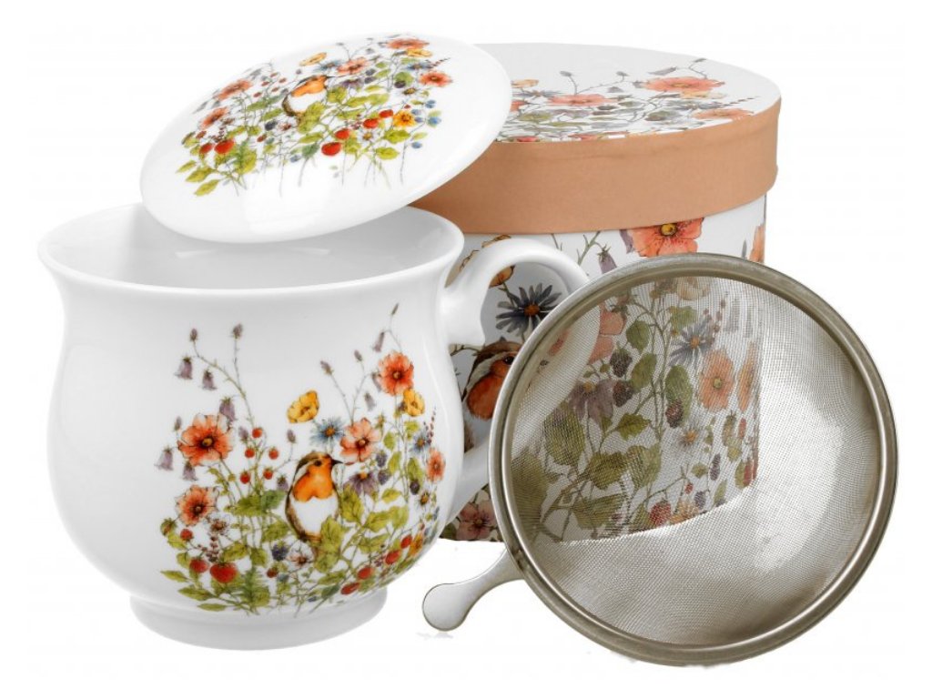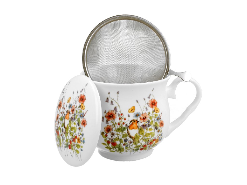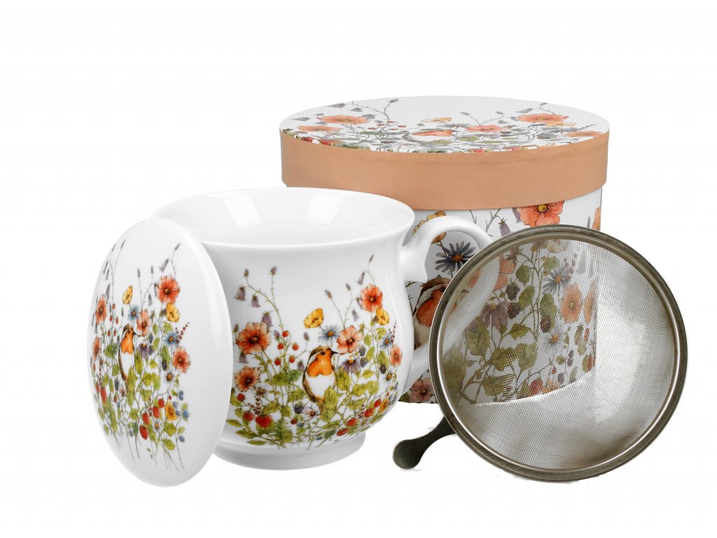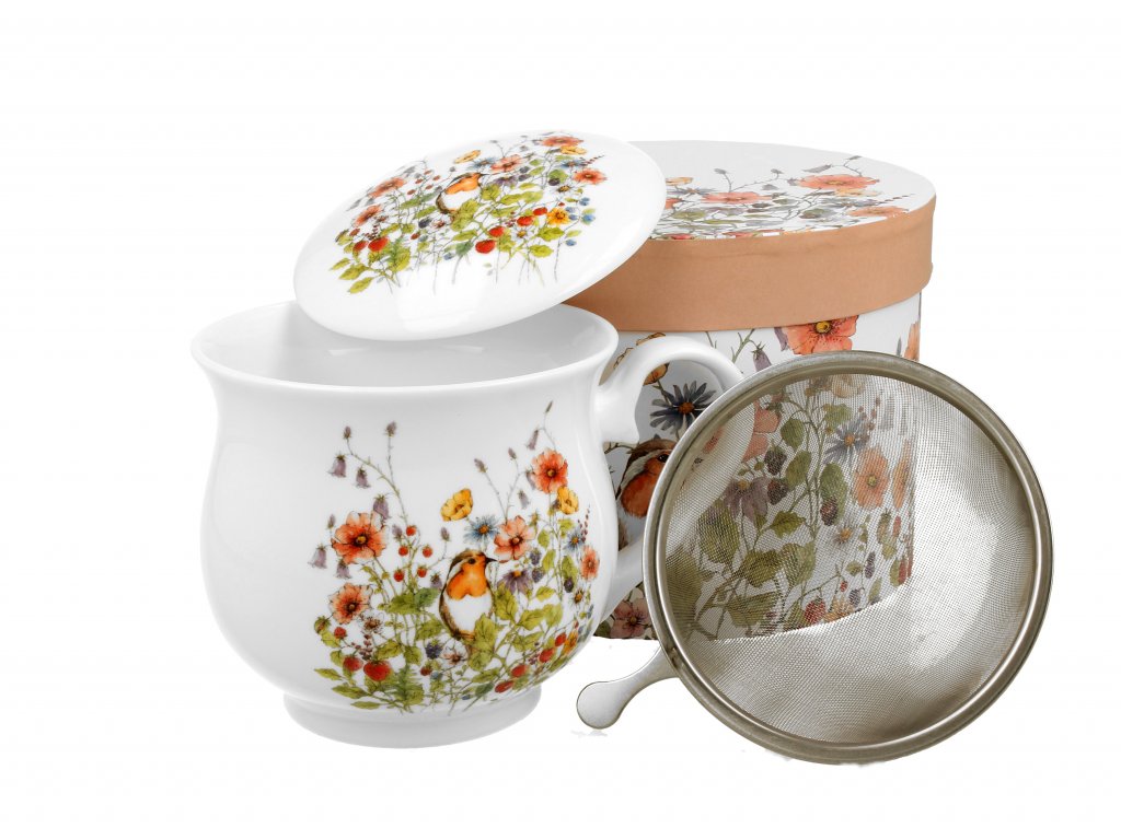 DG - Porcelánový retro hrnek PTÁČEK v lučním kvítí se sítkem a víčkem v dárkové krabičce - 480 ml