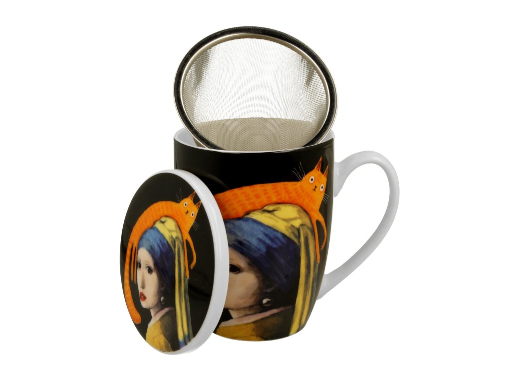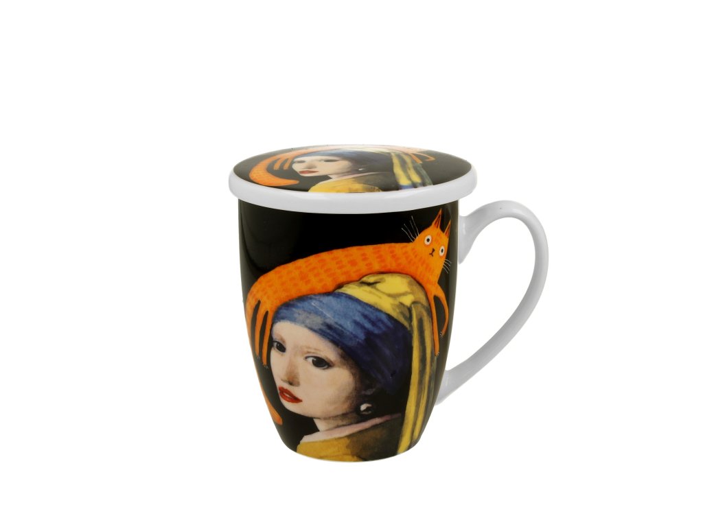 DP - Porcelánový hrnek se sítkem a víčkem Dívka s kočkou - 360 ml