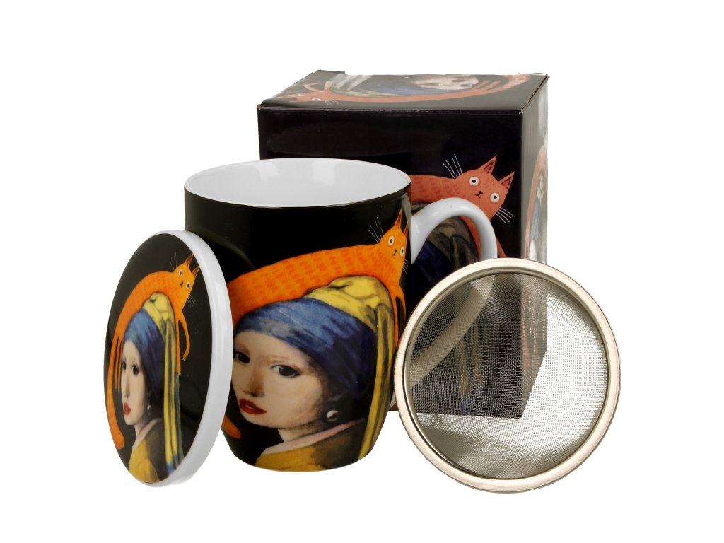 Porcelánový hrnek se sítkem a víčkem Mona Lisa s kočkou, součást série Animals, je vyroben z nového kostního porcelánu, který se vyznačuje přírodní krémově bílou barvou s jemným leskem a výjimečnou pevností a odolností, přičemž si zachovává lehký a elegantní pocit. Ideální pro přípravu vašeho oblíbeného čaje a aromatických bylin.Tato řada byla pečlivě navržena s ohledem na milovníky umění a unikátních předmětů. Rozmarný motiv zobrazuje kreativní interpretaci obrazu "Mona Lisa" od Leonarda da Vinci s namalovanou černou kočkou na hlavě, což dodává dílu jedinečný charakter. Tento nekonvenční design kombinuje eleganci klasické malby s moderním přístupem k designu, díky čemuž je kolekce vynikající volbou pro každého, kdo oceňuje originalitu.Hrnek, balený v dekorativní krabičce zdobené stejným motivem, je perfektním dárkem pro každého, kdo oceňuje jedinečný design a špetku humoru ve svém životě. Dopřejte své kuchyni nádech radosti a překvapte své hosty originálním designem.